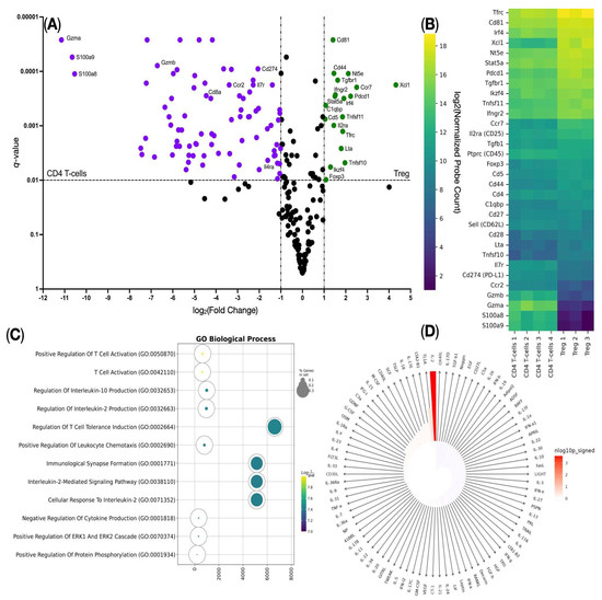Figure 3. NanoString gene expression analysis of the CD4 T cells transdifferentiated into CD4 Treg. (A) Volcano plot of the differentially expressed genes: up-regulated genes are highlighted in green, down-regulated genes are highlighted in purple. (B) Heat map of the log2(Normalized Probe Counts) of the differentially expressed genes and the Treg-defining genes: the deep purple color marks the lowest marker expression, where the yellow color marks the highest marker expression. (C) Gene Ontology Biological Process overrepresentation analysis of the up-regulated genes: the yellow color corresponds to the lowest q-value, the deep purple color corresponds to the highest q-value, and the dot size reflects the percentage of genes included in the analysis relative to the full set of genes in the Gene Ontology Biological Process database. (D) Immune Response Enrichment Analysis (IREA) of the up-regulated genes: the cytokine that is significantly active in the analyzed Treg (IL-2) is highlighted in the deep red color (n = 1 technical replicate from 3 to 4 biological replicates in each group).