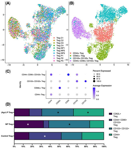 Figure 4. Flow cytometry single-cell data analysis. (A) UMAP plot of the Harmony data integration and batch correction. C—Control Treg; NP—Non-Proliferating Treg; P—Proliferating Treg (ag-Treg); (B) UMAP plot of the Treg-identified clusters. (C) Dot plot of marker expression per cluster: protein marker expression was Z-score-standardized, the gray color marks the lowest expression, while the deep blue color marks the highest expression, and the dot size represents the percentage of cells positive for the marker. White asterisks indicate significant differences in CD62L+ Treg and CD44+ CD95+ CD103+ Treg between the compared groups; Black asterisks indicate differences in CD103+ CD122+ Treg and CD44+ Treg between the compared groups. (D) (n = 1 technical replicates from 4 biological replicates in each group). Dot plot of the percentages of the clusters in each biogroup: horizontal lines on the plot depict medians.