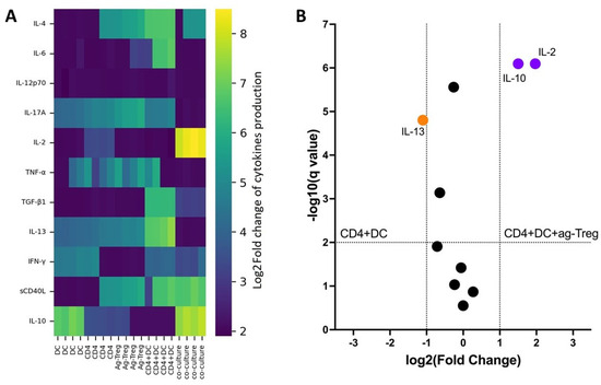 Figure 5. (A) Log2-transformed difference fold changes and (B) volcano plot in cytokine production in mixed lymphocyte reaction with added ag-Tregs obtained by AS2863619 compound (n = 1 technical replicate from 4 biological replicates in each group). Data are presented as a heat map and were pre-optimized by log2 transformation. Co-culture: A group of CD4 T cells to which dendritic cells and ag-Tregs were added. One-way ANOVA analysis (paired comparisons with the q-values < 0.01).