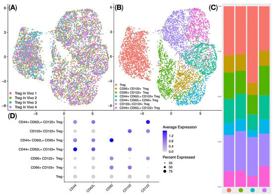 Figure 7. In Vivo Treg flow cytometry single-cell data analysis. (A) UMAP plot of the Harmony data integration and batch correction. (B) UMAP plot of the In Vivo Treg clusters. (C) Stacked bar plot of the proportions of clusters per sample: sample colors are in accordance with the colors of samples in subfigure (A), and cluster colors are in accordance with the colors of clusters in subfigure (B). (D) Dot plot of marker expression: protein marker expression was Z-score-standardized, the gray color marks the lowest expression, while the deep blue color marks the highest expression, and the dot size represents the percentage of cells positive for the marker (n = 1 technical replicate from 4 biological replicates in each group).