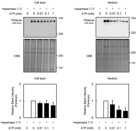 Proteoglycans were extracted from the cell layer and conditioned medium of vascular endothelial cells under dissociative conditions as previously described [45]. Vascular endothelial cells cultured in a 100 mm culture dish were treated with or without ATP (0.01, 0.1, and 1 mM) for 12 h. After incubation, the conditioned medium was collected, and solid urea was added to a final concentration of 8 M. The cell layer was washed twice with CMF-PBS and lysed with 8 M urea cell extraction solution containing 120 mM 6-aminohexanoic acid, 12 mM benzamidine, 10 mM N-ethylmaleimide, 2 mM Ethylenediaminetetraacetic acid (EDTA), 0.1 M phenylmethanesulfonyl fluoride, 0.1 M sodium chloride, and 2% Triton X-100 in 50 mM Tris-HCl buffer (pH 7.5). The extracts were applied to the diethylaminoethyl-Sephacel (300 μL of resin) column and washed four times with 8 M urea buffer containing 0.25 M sodium chloride, 2 mM EDTA, and 0.5% Triton X-100 in 50 mM Tris-HCl buffer (pH 7.5). Proteoglycans were eluted with 0.9 mL of 8 M urea buffer containing 3 M sodium chloride, 2 mM EDTA, and 0.5% Triton X-100 in 50 mM Tris-HCl buffer (pH 7.5). The eluted samples were added to 5 μL of a 5 mg/mL chondroitin sulfate C solution and 3.5 volumes of 1.3% potassium acetate in 95% ethanol, incubated at −20 °C for 2 h, and centrifuged at 15,000× g for 15 min at 4 °C, and the supernatant was removed; this step was repeated until urea was completely removed. The precipitated samples were further digested with 0.02 IU/mL heparinase II/III in 100 mM Tris-HCl buffer (pH 7.0) containing 10 mM calcium acetate, 18 mM sodium acetate, 2 mM 6-aminohexanoic acid, 0.2 mM benzamidine hydrochloride monohydrate, and 20 μM phenylmethanesulfonyl fluoride at 37 °C for 3 h. The samples were lysed using sodium dodecyl sulfate sample buffer (50 mM Tris-HCl buffer solution containing 2% sodium dodecyl sulfate and 10% glycerol; pH 6.8), followed by incubation at 95 °C for 3 min. Then, Western blotting analysis was performed as described below.