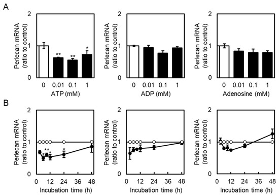 Effects of ATP, ADP, and adenosine on perlecan mRNA levels in vascular endothelial cells. (A) Vascular endothelial cells were treated with or without ATP, ADP, and adenosine (0.01, 0.1, and 1 mM) for 12 h, and perlecan mRNA expression levels were determined via reverse transcription polymerase chain reaction (RT-PCR). Each value represents the mean ± S.E. of three independent samples. * p < 0.05 and ** p < 0.01 vs. the corresponding untreated cells. (B) Vascular endothelial cells were treated with or without ATP, ADP, and adenosine (1 mM) for 3, 6, 9, 12, 24, and 48 h, and perlecan mRNA expression levels were determined via reverse transcription polymerase chain reaction (RT-PCR). Unfilled circles indicate untreated cells, whereas filled circles indicate cells treated with ATP, ADP, or adenosine. Each value represents the mean ± S.E. of three independent samples. * p < 0.05 and ** p < 0.01 vs. the corresponding untreated cells.