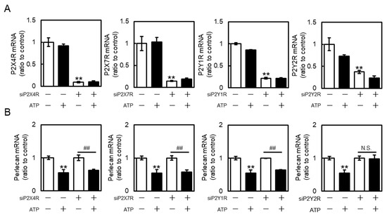 Roles of purinergic P2 receptors in perlecan suppression by ATP in vascular endothelial cells. Vascular endothelial cells transfected with the control, P2X4 receptor (P2X4R), P2X7 receptor (P2X7R), P2Y1 receptor (P2Y1R), or P2Y2 receptor (P2Y2R) small interfering RNA (siRNA) for 24 h were treated with or without ATP (1 mM) for 12 h, and (A) purinergic P2X4R, P2X7R, P2Y1R, P2Y2R, and (B) perlecan mRNA levels were determined via RT-PCR. Each value represents the mean ± S.E. of three independent samples. ** p < 0.01 vs. control siRNA-transfected cells without ATP; ## p < 0.01 vs. P2X4R-, P2X7R-, P2Y1R-, or P2Y2R siRNA-transfected cells without ATP. N.S. indicates not significant.