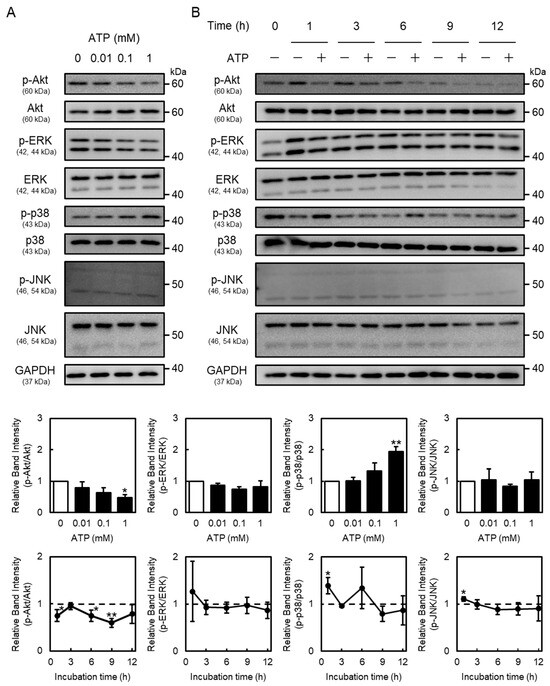 Effects of ATP on Akt and mitogen-activated protein kinase (MAPK) signaling in vascular endothelial cells. Vascular endothelial cells were treated with or without (A) ATP (0.01, 0.1, and 1 mM) for 1 h or (B) ATP (1 mM) for 1, 3, 6, 9, or 12 h, and phosphorylated Akt (p-Akt), Akt, phosphorylated extracellular signal-regulated kinase (p-ERK), ERK, phosphorylated p38 MAPK (p-p38 MAPK), p-38 MAPK, phosphorylated c-Jun N-terminal kinases (p-JNK), JNK, and glyceraldehyde 3-phosphate dehydrogenase (GAPDH) protein levels were determined via Western blotting. GAPDH was used as a loading control. Each value represents the mean ± S.E. of three independent samples. * p < 0.05 and ** p < 0.01 vs. control.