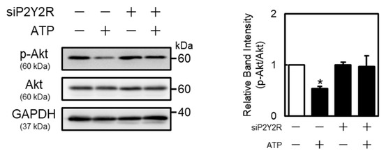 As the P2Y2R regulates Akt and mitogen-activated protein kinase (MAPK) (extracellular signal-regulated kinase (ERK), p38 MAPK, and c-Jun N-terminal kinases (JNK)) signaling [25,26], this study investigated the activation of Akt, ERK, p38 MAPK, and JNK by extracellular ATP in vascular endothelial cells. These proteins were detected at approximately 60 kDa (Akt), 42 and 44 kDa (ERK), 43 kDa (p38 MAPK), 46 and 54 kDa (JNK), and 36 kDa (GAPDH), respectively. Phosphorylated Akt protein levels in vascular endothelial cells were decreased by ATP in concentration- and time-dependent manners (Figure 4). Moreover, phosphorylated p38 MAPK protein levels were increased after ATP treatment at 1 h. Notably, phosphorylated JNK levels were not affected by ATP (Figure 4), suggesting that extracellular ATP suppresses the activation of only Akt signaling in vascular endothelial cells. As shown in Figure 5, phosphorylated Akt levels decreased by ATP were restored by the knockdown of P2Y2R, suggesting that Akt signaling suppression by ATP is mediated by the P2Y2R in vascular endothelial cells.