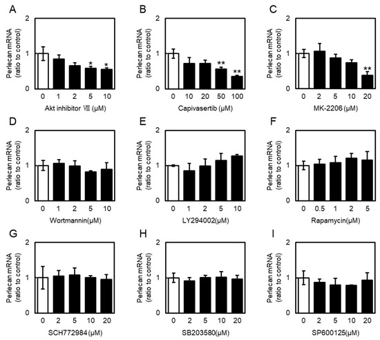 Effects of phosphoinositide 3-kinase (PI3K)/Akt pathway activators and inhibitors on perlecan mRNA levels in vascular endothelial cells. Vascular endothelial cells were treated with Inhibitors of (A) Akt (Akt inhibitor VIII), (B) Akt (capivasertib), (C) Akt (MK-2206), (D) PI3K (wortmannin), (E) PI3K (LY294002), (F) mammalian target of rapamycin complex 1 (mTORC1) (rapamycin), (G) ERK (SCH772984), (H) p38 MAPK (SB203580), and (I) JNK (SP600125) for 12 h. Perlecan mRNA levels were determined via RT-PCR. Each value represents the mean ± S.E. of three independent samples. * p < 0.05 and ** p < 0.01 vs. control.