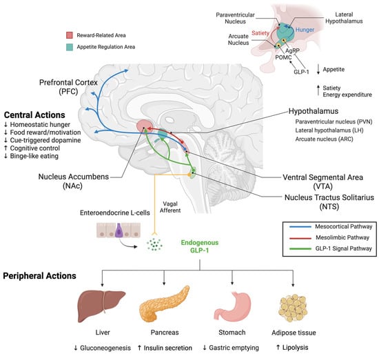 Integrated Peripheral and Central GLP-1 Modulation of Appetite and Reward Pathways. Peripheral Actions: GLP-1, an incretin hormone secreted by enteroendocrine L-cells in the intestinal tract, acts on multiple peripheral organs. In the pancreas, GLP-1RAs stimulate insulin secretion and inhibit glucagon release. In the stomach, they delay gastric emptying to promote satiety. In the liver, they regulate glucose metabolism. In adipose tissue, they modulate energy expenditure and metabolism. GLP-1 signals via vagal afferent nerves to the nucleus tractus solitarius (NTS) in the brainstem, establishing direct gut–brain communication. Central Actions and Reward Circuits: The NTS serves as a critical integration hub, both receiving peripheral GLP-1 signals and producing GLP-1 centrally. NTS GLP-1 neurons send projections to reward centers, including the VTA and NAc, and appetite-regulating nuclei in the hypothalamus. The mesolimbic reward circuit originates from dopaminergic neurons in the VTA that project to the NAc, regions critical for reward-related behaviors. Within the hypothalamus, key appetite-regulating regions include the LH, PVN, and ARC. In the ARC, GLP-1 activates POMC neurons to promote satiety while inhibiting AgRP neurons to suppress hunger. These integrated signals from reward and homeostatic centers project to the PFC, where feeding behavior and reward processing are coordinated. Through these coordinated peripheral and central mechanisms, GLP-1RAs modulate both metabolic function and reward-driven eating behavior. Color coding: Blue = mesocortical pathway (reward centers to PFC), red = mesolimbic dopaminergic pathway (VTA to NAc), green = central GLP-1 neuronal projections (NTS to hypothalamus and reward regions), yellow = peripheral GLP-1 signaling (intestinal L-cells to brainstem via vagal afferents). Arrows indicate neural projections and signaling pathways; (↑) indicates stimulatory effects, (↓) indicates inhibitory effects. Created with www.BioRender.com (accessed on 15 September 2025). Abbreviations: AgRP, agouti-related peptide; ARC, arcuate nucleus; GLP-1, glucagon-like peptide-1; LH, lateral hypothalamic area; NAc, nucleus accumbens; NTS, nucleus tractus solitarius; PFC, prefrontal cortex; POMC, pro-opiomelanocortin; PVN, paraventricular nucleus; VTA, ventral tegmental area.