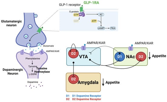 GLP-1 Receptor Signaling Mechanisms in Reward Circuits. GLP-1R activation modulates feeding behavior in key reward-related brain regions, including the VTA, NAc, and amygdala through GPCR signaling. GLP-1R stimulation increases cAMP and activates PKA, triggering intracellular signaling cascades that result in altered neurotransmitter release and synaptic transmission for appetite regulation. In the VTA and NAc, GLP-1R activation enhances presynaptic glutamate release, which stimulates postsynaptic AMPAR/KAR on target neurons. In the NAc, this glutamatergic mechanism activates D2-MSNs, contributing to appetite suppression through increased downstream inhibition of reward targets. Dopaminergic projections from the VTA to the NAc modulate reward-related behaviors, while GABAergic feedback from the NAc D1-MSNs to the VTA regulates dopaminergic neuron activity and modulates dopamine release to balance reward and motivational signals associated with food intake. D2 autoreceptors on VTA dopamine neurons provide additional negative feedback, further modulating dopamine release. VTA dopaminergic projections also innervate the amygdala, regulating emotional aspects of feeding behavior. Created with www.BioRender.com (accessed on 15 September 2025). Abbreviations: AMPAR/KAR, AMPA/kainate receptors; cAMP, cyclic adenosine monophosphate; D1-MSNs, dopamine D1 receptor-expressing MSNs; D2-MSNs, dopamine D2 receptor-expressing MSNs; GABA, gamma-aminobutyric acid; GLP-1R, glucagon-like peptide-1 receptor; GPCR, G protein-coupled receptor; MSNs, medium spiny neurons; NAc, nucleus accumbens; PKA, protein kinase A; VTA, ventral tegmental area.