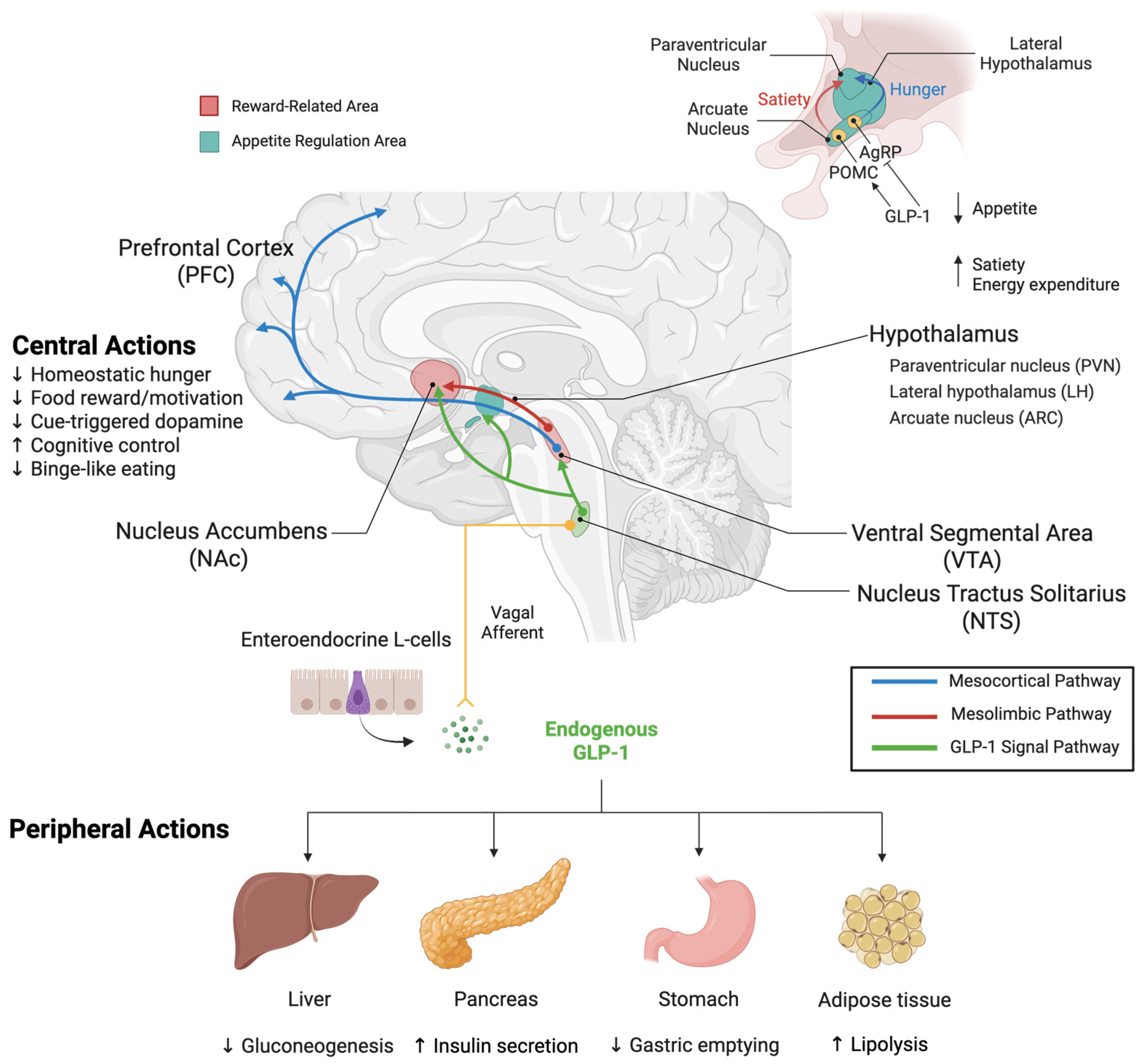 GLP-1RAs exert their therapeutic effects through both peripheral and central mechanisms, acting as a physiological brake on both appetite and reward-driven food consumption. Understanding the distinction between these pathways is crucial for comprehending their therapeutic potential in eating disorders.