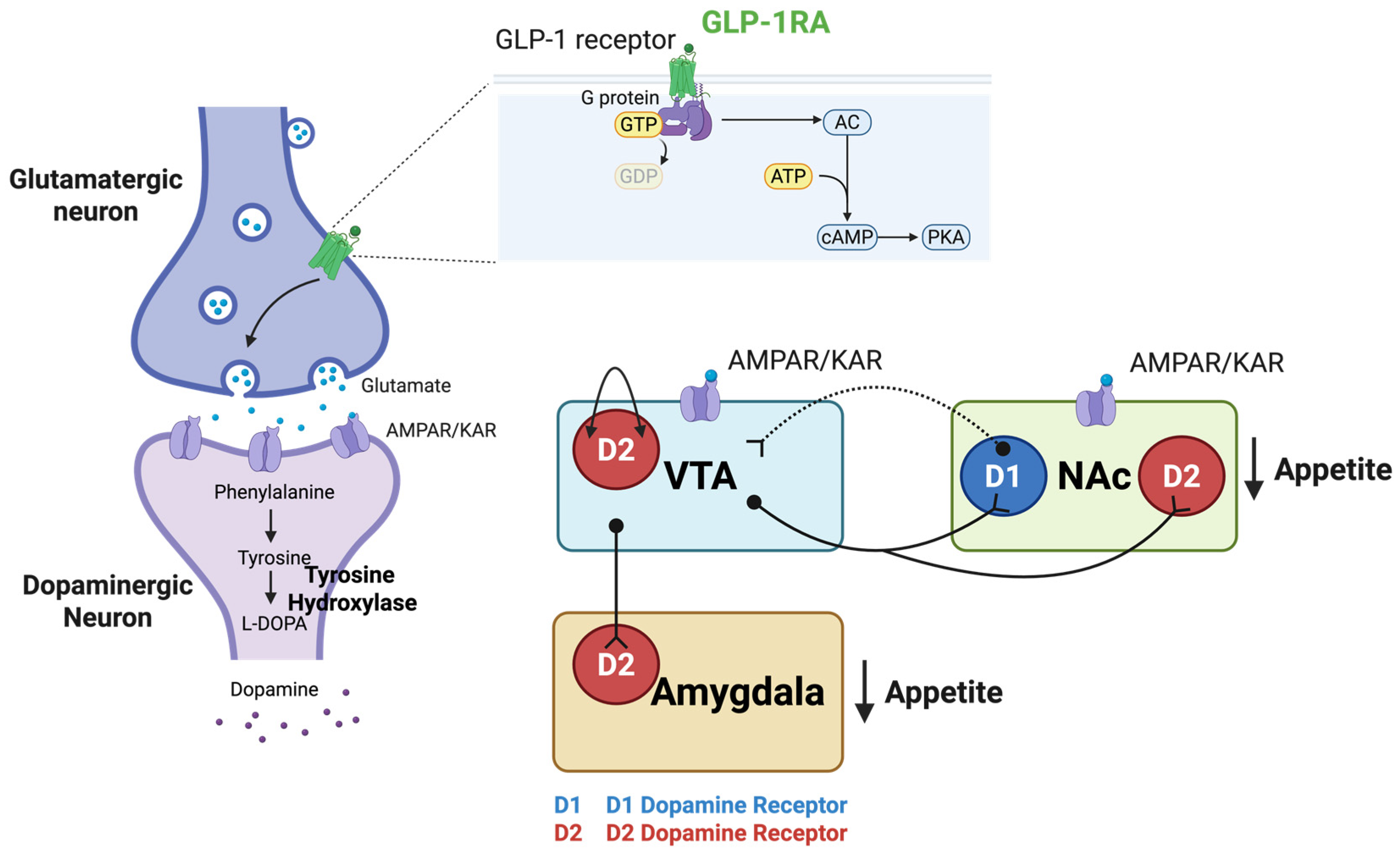 In the VTA, GLP-1R activation exhibits complex effects that may differ from expected dopaminergic outcomes. Ex-4 administration enhances presynaptic glutamatergic release via AMPA/kainate receptors (AMPA/KAR), increasing tyrosine hydroxylase expression and dopaminergic neuron firing [177]. However, this increased VTA activity preferentially directs dopamine release toward the amygdala rather than the NAc, where amygdala dopamine D2 receptor activation suppresses food intake [205]. This mechanism explains how increased VTA firing can ultimately suppress feeding behavior despite dopamine’s traditional role in reward enhancement. Within the VTA, D2 autoreceptors on dopamine neurons provide additional negative feedback that regulates dopamine release [206].