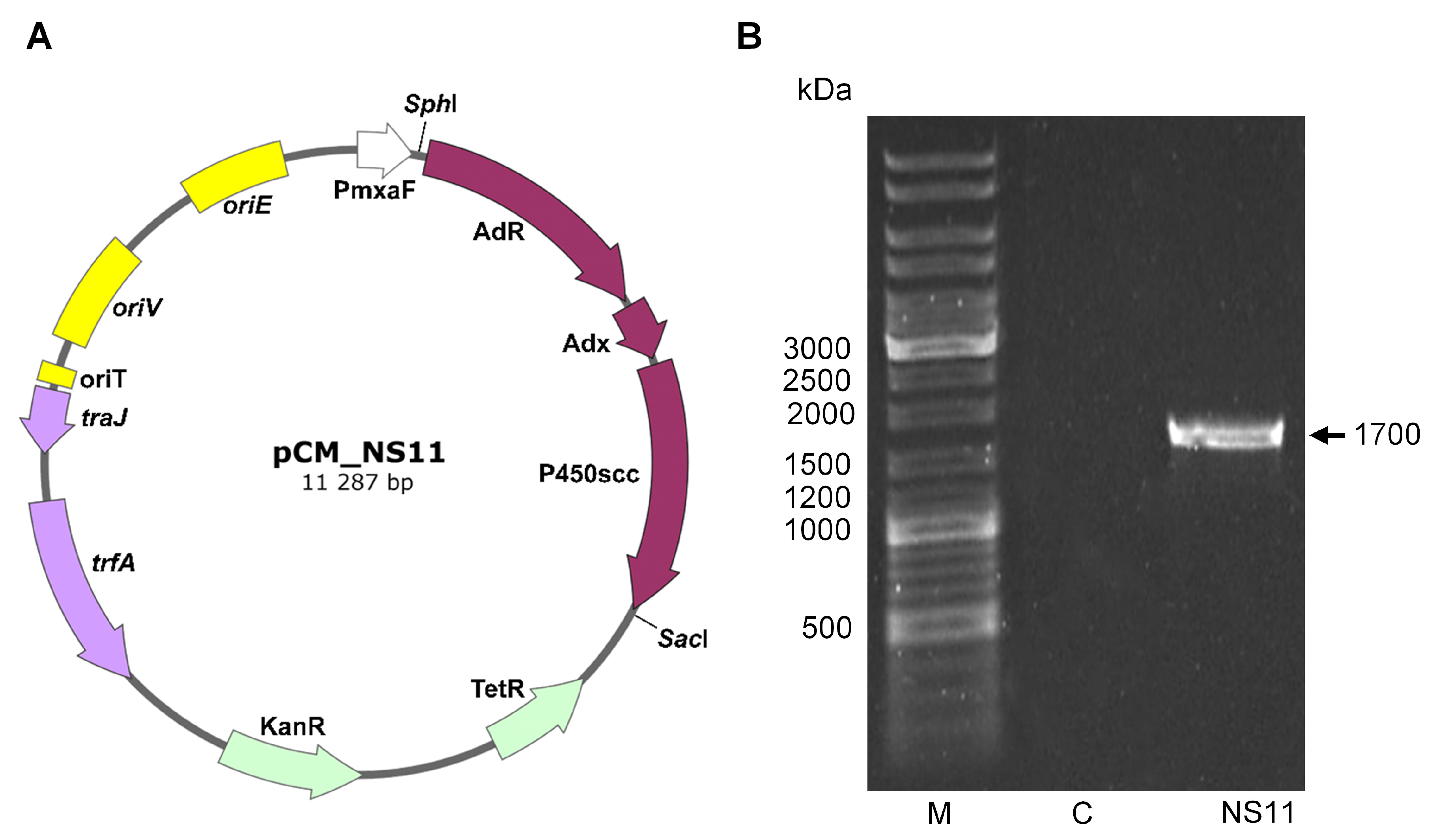 | pNS11 | The pMyNT vector included 3.3 kb fragment with cDNA, encoding RBS-AdR-RBS-Adx-RBS-CYP11A1 | [17] |