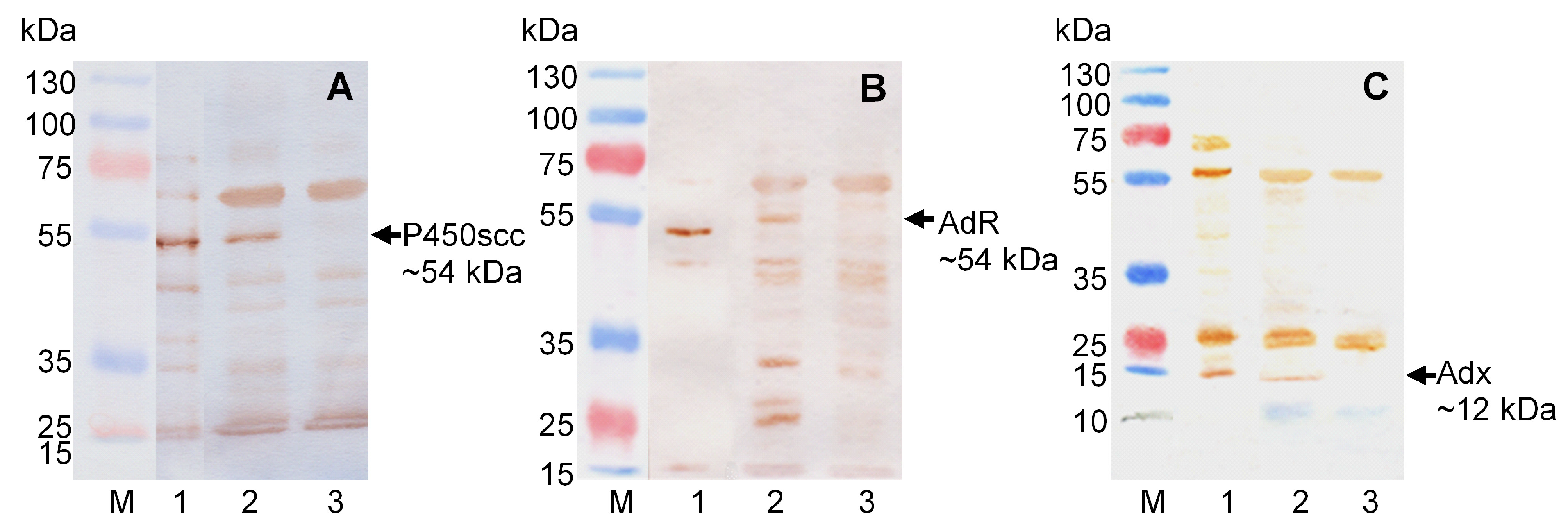 - Makeeva, D.S.; Dovbnya, D.V.; Donova, M.V.; Novikova, L.A. Functional reconstruction of bovine P450scc steroidogenic system in Escherichia coli. Amer. J. Mol. Biol. 2013, 3, 173–182. [Google Scholar] [CrossRef][Green Version]
