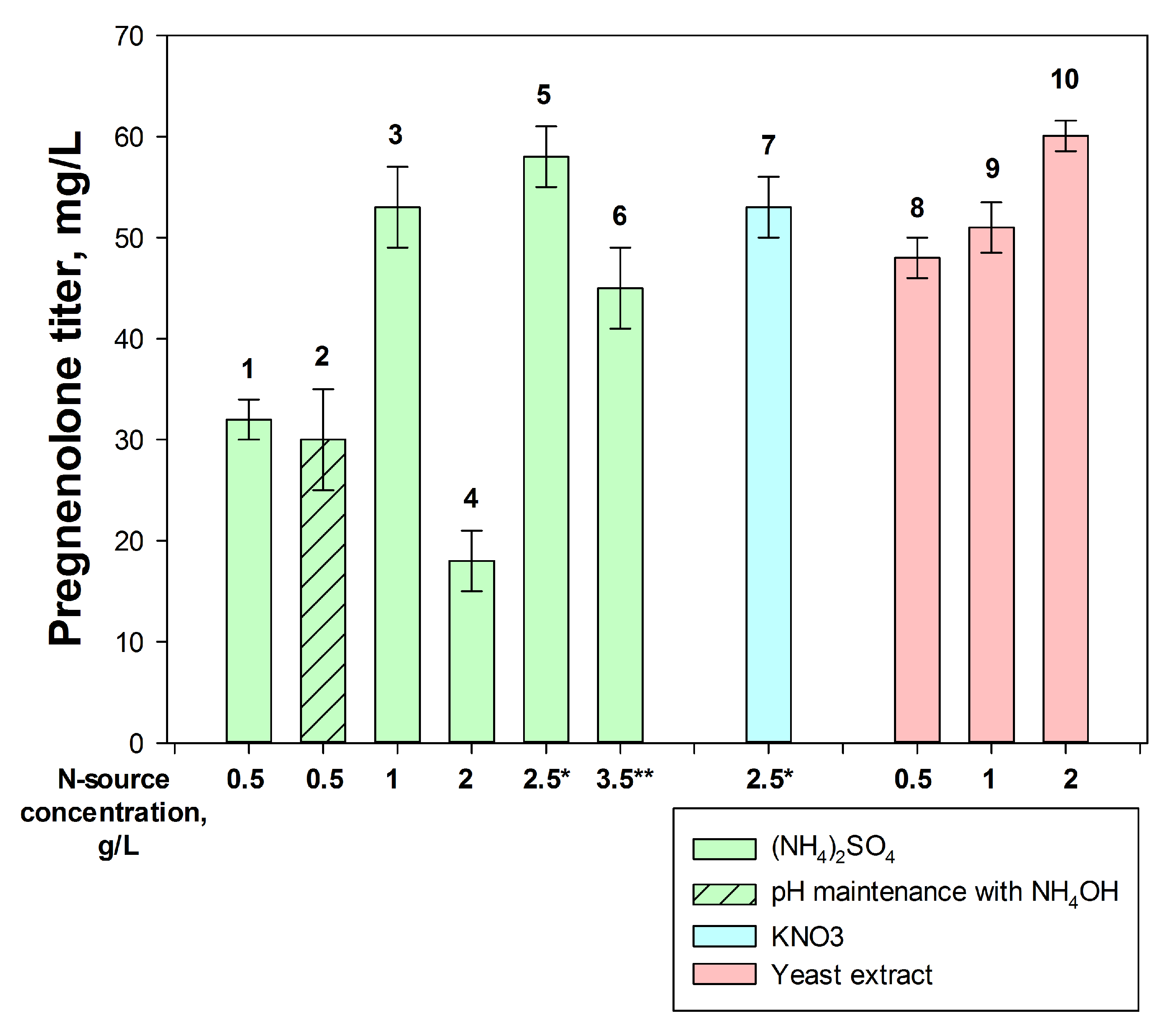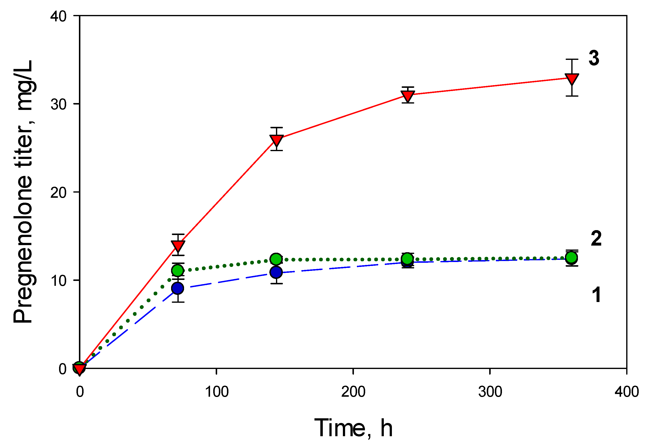 - Karpov, M.; Strizhov, N.; Novikova, L.; Lobastova, T.; Khomutov, S.; Shutov, A.; Kazantsev, A.; Donova, M. Pregnenolone and progesterone production from natural sterols using recombinant strain of Mycolicibacterium smegmatis mc2 155 expressing mammalian steroidogenesis system. Microb. Cell Fact. 2024, 23, 105. [Google Scholar] [CrossRef]