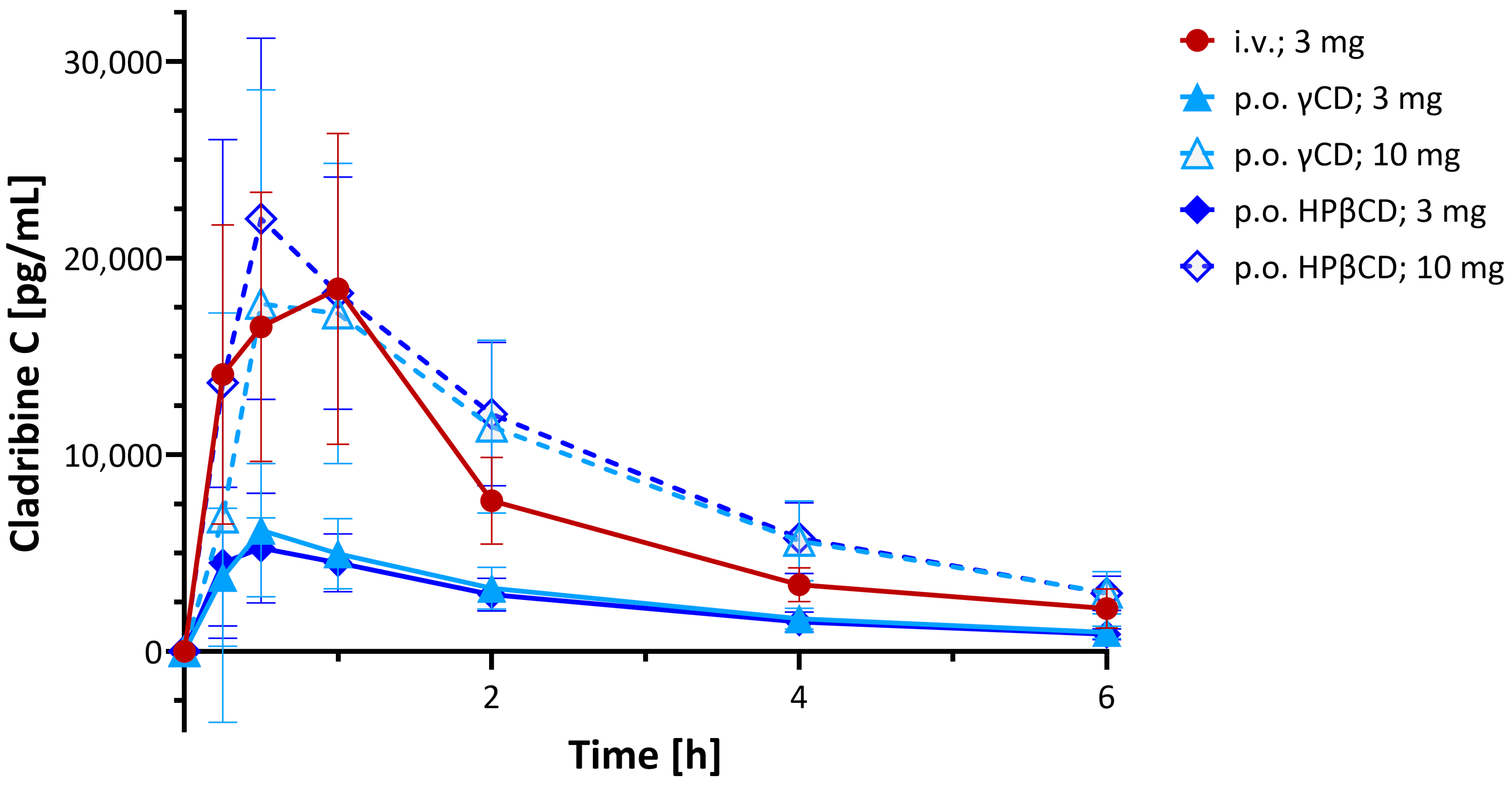 - Liu, H.; Guo, S.; Wei, S.; Liu, J.; Tian, B. Pharmacokinetics and pharmacodynamics of cyclodextrin-based oral drug delivery formulations for disease therapy. Carbohydr. Polym. 2024, 329, 121763. [Google Scholar] [CrossRef]