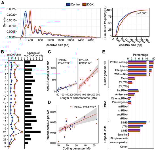 Subsequently, we analyzed the characteristics of eccDNA in HCC HepG2 cells before and after DNA damage. We found that nearly all eccDNA (control, 97%; DOX, 98%) lengths ranged from 0 to 3 kb, and the DOX group showing a significant increase in eccDNA length compared to the control group (p < 0.0001, Mann–Whitney test) (Figure 1A). This suggests that DOX-induced DNA damage may induce new fragment fusions leading to longer eccDNAs. Additionally, both control and DOX eccDNA lengths displayed a periodic distribution with a 200 bp interval, with primary peaks around 200 bp and 400 bp, consistent with previous findings linking eccDNA biogenesis to nucleosome positioning [13,14]. Furthermore, we calculated eccDNA density on each chromosome and found that eccDNA density on all chromosomes in DOX group was higher than that in control group (Figure 1B), with chr20 showing the most significant increase. The significant increase in eccDNA density observed on chr20 is likely due to a higher degree of DNA fragmentation on this chromosome after DOX-induced DNA damage, which results in an elevated level of eccDNA formation. Pearson correlation analysis confirmed a significant positive correlation between eccDNA abundance and both chromosome length and coding gene density (Figure 1C,D).