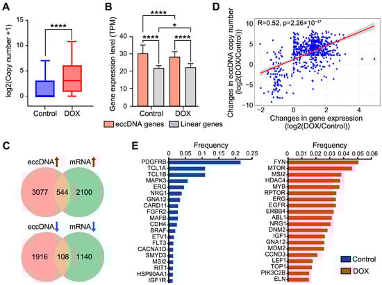EccDNA generally exhibits higher copy numbers than linear chromosomes, thereby driving tumor progression [15]. We therefore assessed whether DNA damage in HCC HepG2 cells affects eccDNA copy number. As expected, DOX-induced DNA damage led to a significant increase in eccDNA copy number in HCC HepG2 cells (p-value = 1.85 × 10−5) (Figure 2A). The high copy number of eccDNA often results in rapid amplification of the genes located on eccDNA, thereby increasing tumor cell heterogeneity and contributing to drug resistance [16,17]. We identified genes on eccDNA, a total of 2034 genes were detected on 2168 out of 4307 eccDNAs (50.3%) in the control group, while 4659 genes were detected on 6150 out of 12,174 eccDNAs (50.5%) in the DOX group (Supplementary Table S2). Functional enrichment pathway analysis revealed that eccDNA genes were enriched in liver cancer and tumor progression-related pathways. After DOX-induced DNA damage, eccDNA genes were specifically enriched in DNA damage-related pathways, such as PI3K-Akt and mTOR pathways (Figure S1), suggesting their participation in the DNA damage response process.