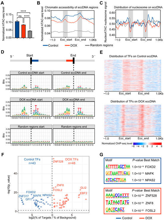 Chromatin accessible regions are often enriched with transcription factors (TFs). We analyzed 716 TFs from the ENCODE database for HepG2 cells, finding that DOX-induced DNA damage shifted TF enrichment from a uniform distribution across eccDNA regions to a significant concentration at eccDNA breakpoint regions (Figure 3E). This suggests that these TFs bound near eccDNA breakpoints may be related to the process of DNA breakage and eccDNA biogenesis. To further explore the functions of TFs bound near eccDNA breakpoints, motif analysis was performed on 50 bp regions flanking the breakpoints (Figure 3F). The results indicated that, after DOX-induced DNA damage, various TFs related to DNA damage repair were bound to the eccDNA breakpoint regions, such as ZNF528, ZNF8 [27], and FOSL2 [28] (Figure 3G), consistent with reports linking DNA damage repair to eccDNA biogenesis [6].