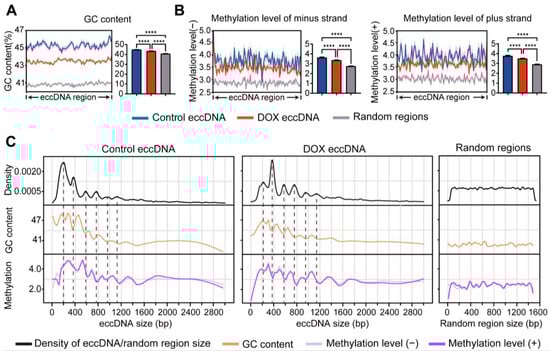 Analysis of GC content and methylation levels in eccDNA regions. (A,B), Comparison of GC content (A) and methylation levels (B) among control eccDNA, DOX eccDNA, and random genomic regions. Data are presented as mean ± SEM. Statistical significance was assessed using unpaired non-parametric Kruskal–Wallis (K-W) tests. **** p < 0.0001. (C), Periodic changes in GC content and methylation levels with eccDNA length.