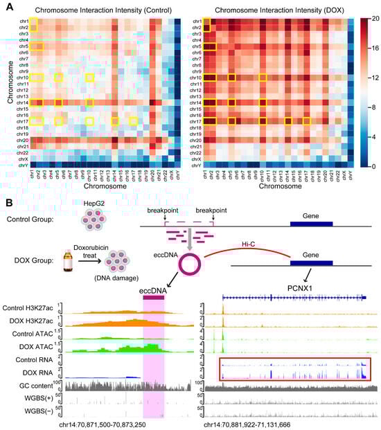 Previous studies have shown that eccDNA can function as the mobile enhancer, interacting with linear chromosomes to regulate tumor development [31,32]. To explore how DOX-induced DNA damage influences the role of eccDNA as the mobile enhancer, we first analyzed HepG2 Hi-C data to define eccDNA regions with chromatin interactions as mobile enhancer eccDNA (ME-eccDNA). We then identified the interaction frequency of ME-eccDNA regions with other chromosomal regions. The results revealed that after DOX-induced DNA damage, the interaction frequency of ME-eccDNA regions generally increased on all chromosomes, particularly on chr1, chr2, chr5, chr10, chr14, and chr17 (Figure 5A).