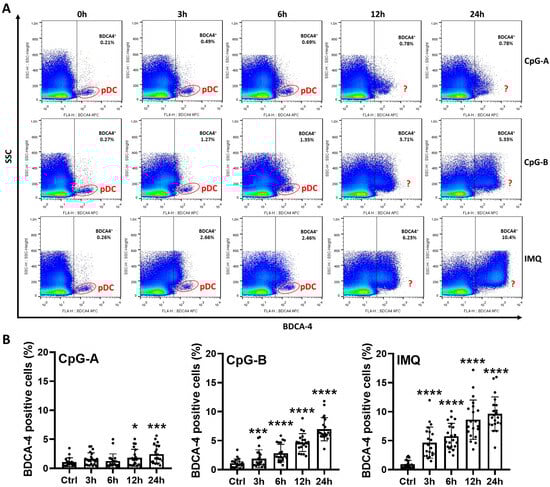 Following 12 and 24 h of CpG-A stimulation, the proportion of BDCA-4-positive cells increased more than threefold compared to untreated samples, although still remaining below 1%. In PBMCs activated with CpG-B for 12 and 24 h, BDCA-4-positive cells accounted for approximately 3–5%, while in Imiquimod-treated samples, the proportion reached approximately 6–10% (Figure 1A,B). Given that pDCs normally comprise less than 1% of total PBMCs [], these results suggest that the higher proportion of BDCA-4 positivity is likely due to induction of BDCA-4 on other cell types following activation. Overall, these findings indicate that in PBMCs, pDC identification based solely on BDCA-4 positivity is not feasible after more than 12 h of stimulation with pDC-specific endosomal TLR agonists.