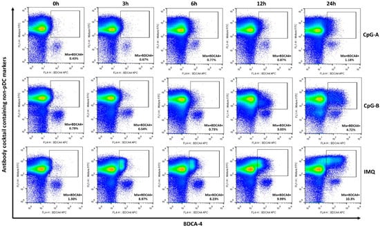 Following gating with this method, backgating onto previously described forward and side scatter (FSC–SSC) parameters was performed on the gated pDC population [,]. A detailed description of the gating strategy for the pDC population is provided in the Supplementary Materials (Supplementary Figure S1). In the gated pDC population, both the percentage of pDCs and the median fluorescence intensity (MFI) of BDCA-4 were determined in untreated and activated cells. (Supplementary Figure S2A–F). In CpG-A–treated samples, only 24 h activation caused a significant increase in the proportion of BDCA-4-positive pDCs (Supplementary Figure S2A), whereas in CpG-B– and Imiquimod-activated cells, the percentage of BDCA-4-positive pDCs was significantly elevated at 6, 12, and 24 h, remaining within the typical pDC proportion range in PBMCs (Supplementary Figure S2B,C). Analysis of BDCA-4 fluorescence intensity in the gated pDC population revealed a significant decrease in BDCA-4 expression on pDCs following CpG-A activation, which became more pronounced with longer incubation times, although complete downregulation was not observed even after 24 h (Supplementary Figure S2D). In contrast, CpG-B–activated pDCs showed increased BDCA-4 surface expression at 6, 12, and 24 h (Supplementary Figure S2E). Similar results were observed in Imiquimod-activated pDCs, with significant increases in BDCA-4 levels at 6 and 12 h; however, after 24 h of Imiquimod stimulation, BDCA-4 levels were no longer significantly elevated compared to untreated samples (Supplementary Figure S2F).