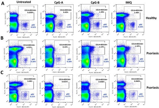 Since we previously observed that BDCA-4 is primarily induced on CD14+ cells following activation, cells were stained for both BDCA-4 and CD14, and the BDCA-4-positive, CD14-negative population was defined as pDCs. Using these two surface markers, the pDC population was clearly identifiable in both healthy donor controls and psoriasis patient samples (Figure 5A–C). In healthy donors, BDCA-4 positivity on CD14+ cells was minimal in untreated samples, whereas, as previously shown, TLR activation increased the proportion of BDCA-4+CD14+ double-positive cells (Figure 5A). Interestingly, in psoriasis patients, BDCA-4+CD14+ cells were present at a higher proportion even in unstimulated samples (Figure 5B,C). Upon TLR agonist stimulation, a 3 h activation significantly reduced the proportion of BDCA-4+CD14+ cells (Figure 5B) or nearly completely suppressed BDCA-4 expression on CD14+ cells (Figure 5C).