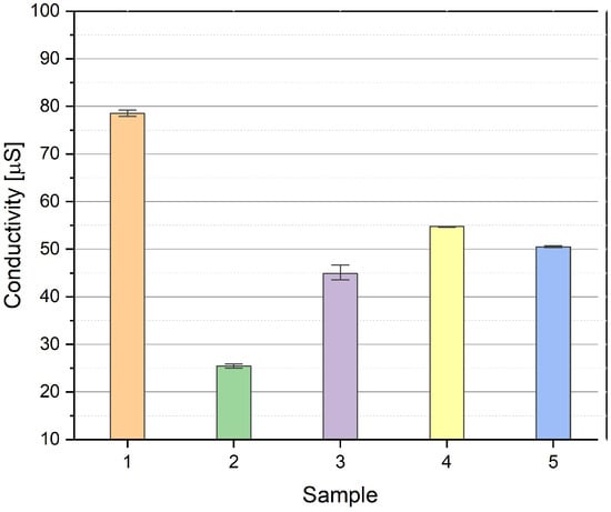 The conductivity of the examined complexes 1–5 is varied (Figure 1). The greatest conductivity (around 80 µS/m) is observed for complex 1 and the lowest for 2. It is determined by the substitution of two chlorides by bromides in the organic ligand in complex 2. Complexes 3–5 demonstrate a roughly similar conductivity, being equal to around 50 µS/m. The conductivity measurements confirm that the studied complexes 1–5 are stable, and the anions are coordinated to the metal ions in the test solution medium.