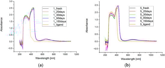 The greatest and perfect stability (evaluated for fresh solutions and after 20, 30, 50 and 150 days) is observed for complex 2, while other complexes demonstrate very high stability as well. Small differences observed for UV-VIS spectra can arise from instrument issues or lower homogeneity of solutions in comparison to complex 2. The transparency of HL3 ligand solution was not complete unlike with other solutions of the ligands and determines greater absorbance for the region 450–1100 nm.