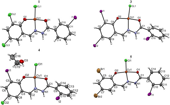 The organic ligands (HL1–HL5) used for the synthesis of complexes 1–5 were obtained following the general procedure reported in our previous paper [6]. All complexes 1–5 were prepared using the same method as described. In general, a stoichiometric amount of appropriate acylhydrazone (1.0 mmol) was dissolved in 20 mL of 99.8% ethanol by stirring at 60 °C for 15 min. A stoichiometric amount of CuCl2 (170.48 mg, 1.0 mmol) was dissolved in 20 mL of 99.8% ethanol and was added dropwise to cool solution of acylhydrazone HL1–HL5 upon mixing. The green solution was further stirred at room temperature for 15 min and filtered. The final solution was left to evaporate for a few days to form crystals used for X-ray diffraction measurements and spectral characterization. The crystals were isolated, washed with dry ethanol and dried in the air at room temperature (Scheme 1). The data from UV-Vis and IR spectra is presented in the form of tables in Supplementary Materials (Table S5 and S6).