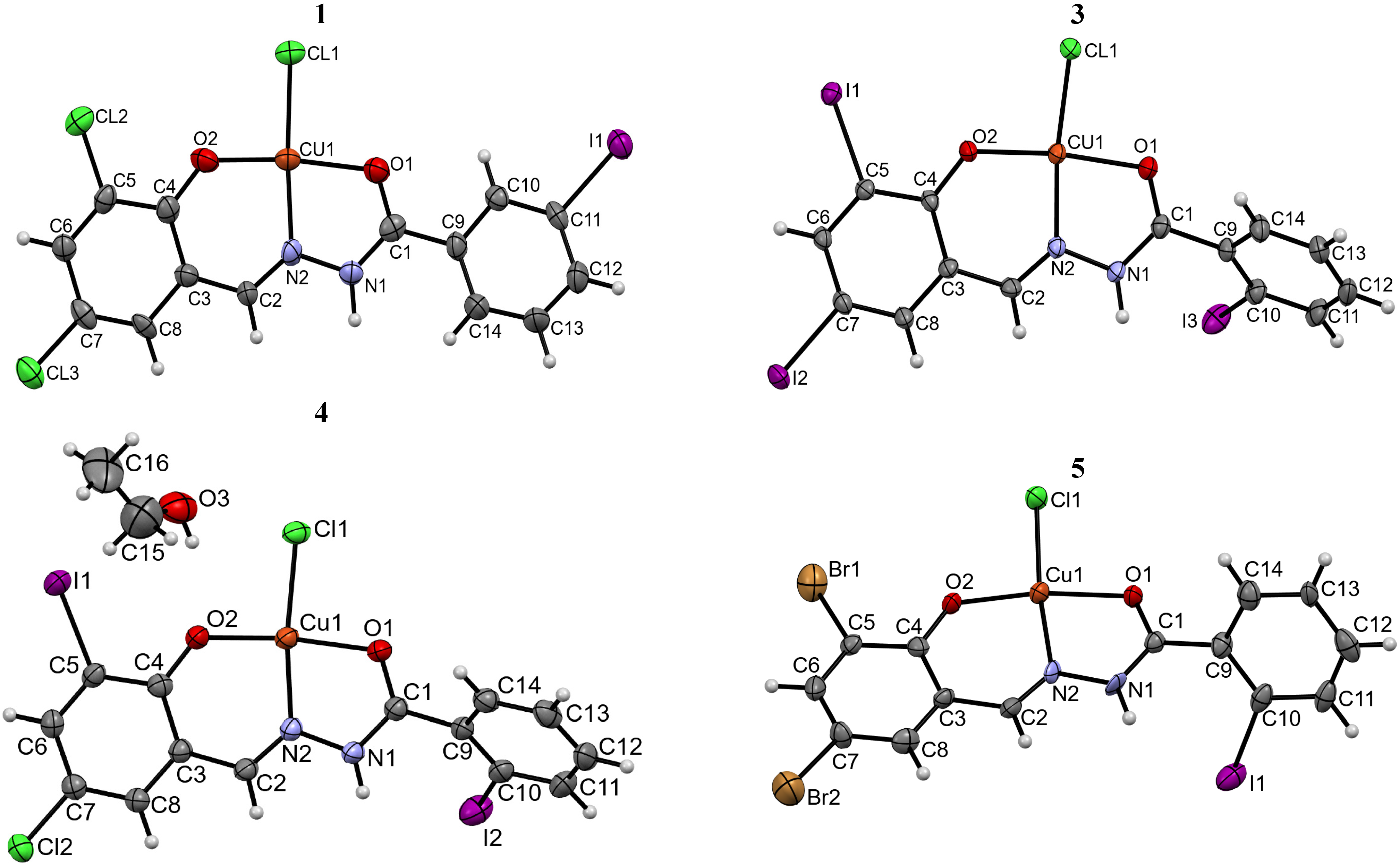 | Chemical formula | C14H8N2O2ICl3Cu | C14H8N2O2I3ClCu | C14H8N2O2I2Cl2Cu ·0.5C2H5OH | C14H8N2O2IBr2ClCu |