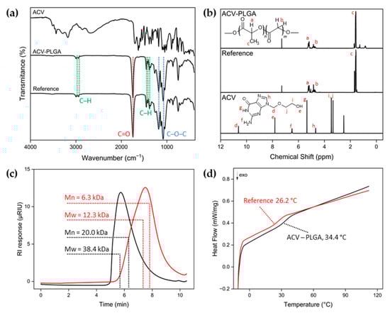 Physicochemical characterization of the ACV–PLGA conjugate and the reference polymer: (a) FTIR spectra of ACV, ACV–PLGA, and the reference synthesis product obtained without ACV; (b) 1H NMR spectra of ACV–PLGA and the reference polymer in CDCl3, with the 1H NMR spectrum of pure ACV recorded in DMSO-d6 shown for comparison. Letters indicate proton assignments: a–c correspond to PLGA backbone and methyl protons, while d–j denote ACV protons as labeled in the structure; (c) GPC chromatograms of ACV–PLGA (black) and the reference polymer (red); and (d) DSC thermograms of ACV–PLGA (black) and the reference polymer (red).