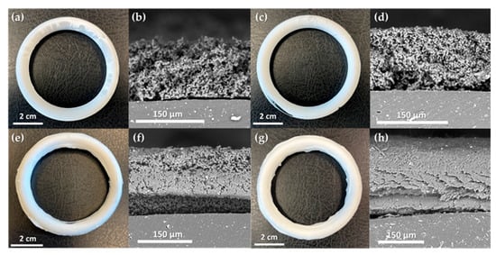 Macroscopic views and SEM cross-sections of coated silicone rings R1–R4: R1 (a,b), R2 (c,d), R3 (e,f), and R4 (g,h). For each ring, the left image shows the macroscopic appearance, and the right image shows the coating morphology.