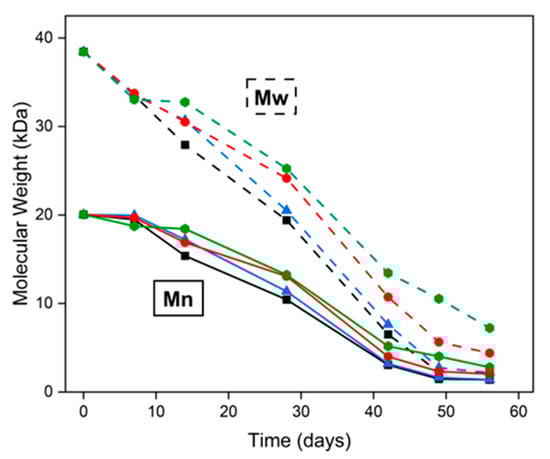The coatings underwent a substantial decrease in molecular weight over the 8-week degradation period, indicative of hydrolytic backbone cleavage. Both Mn and Mw showed marked reductions, reflecting progressive chain scission. Mw dropped more steeply than Mn during the first month, which is consistent with random hydrolytic cleavage of longer polymer chains (Figure 6).
