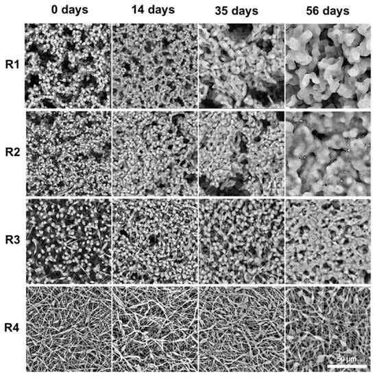 The degradation behavior of PLGA-based systems is well documented, with both microparticles and electrospun fibers known to undergo hydrolytic bulk erosion, leading to gradual loss of structural integrity, polymer molecular weight reduction, and release of incorporated drugs over weeks to months [,]. To evaluate how the different coating architectures influence these processes in the case of ACV-PLGA conjugate, we monitored the morphological evolution, molecular weight, and ACV release profiles of the R1–R4 coatings over a 56-day period. This combined analysis provides insights into how particulate versus fibrous morphologies modulate degradation and drug release kinetics, informing the design of durable, long-acting delivery systems.