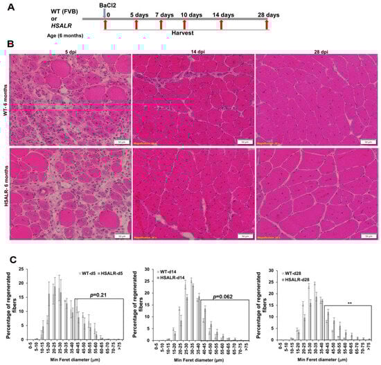 We utilized an induced damage protocol using barium chloride (BaCl2) injections into the TA muscles of HSALR mice to study the effects of expanded (CUG) RNAs on muscle regeneration []. We used a cohort of 6 month old male and female HSALR mice. All mice had myotonia, as confirmed by electromyography (EMG). We injected 50 ul of a 1.2% BaCl2 solution into multiple regions of the right TA of each mouse and an equivalent volume of PBS into the left TA as an undamaged control. We also did the same experiment in wildtype (FVB) mice (6 months old) as a control. The details of this protocol are represented in Figure 2A. We collected tissues from the wildtype and HSALR groups at various times post injury (0, 5, 7, 10, 14, and 28 days). We used tissue staining, immunofluorescence, and quantitative RT-PCR to analyze histology, satellite cells, and muscle regeneration markers. We first studied the histology of the TA muscles at 5 days post injury. We focused on the area where damage was evident, based on the presence of fibers with central nuclei. In HSALR mice, at 5 days post injury (dpi), H&E staining revealed evidence of regeneration, with the number of centrally nucleated fibers being similar to that in wildtype mice (Figure 2B). The staining also showed that fiber maturation and repair of muscle morphology were well underway by 14 days and 28 days post injury. However, the number of internal nuclei in HSALR mice was increased compared to wildtype mice (Figure 2B). The fiber size distribution showed that damaged TA muscles in HSALR mice at 28 days post injury showed a significantly (p = 0.0094) increased proportion of larger fibers compared to wildtype mice. This was similar to what we observed in undamaged TA muscle from HSALR mice. However, there were no differences in fiber size distribution compared to wildtype mice at d5 (p = 0.20) and d14 (p = 0.062) post injury (Figure 2C), though it was trending towards the changes noted at 28 days post injury.
