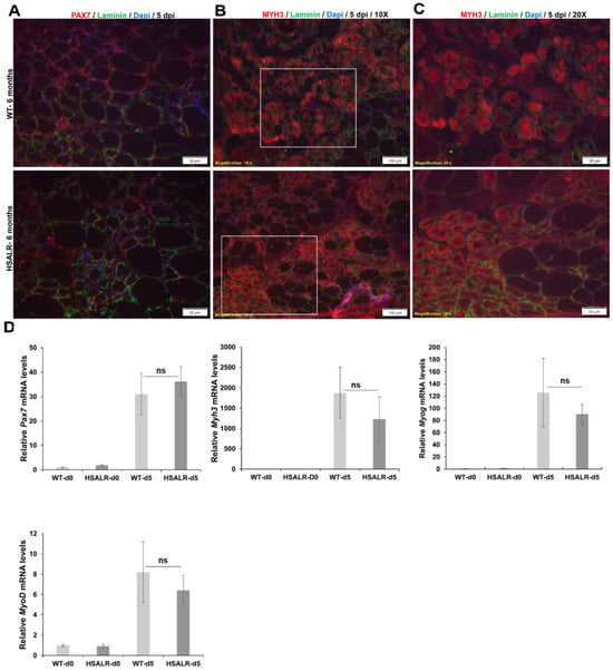 Next, we analyzed muscle regeneration response to damage at 5 days post injury (dpi) using H&E staining. We noted consistent evidence of regeneration with many small fibers with central nuclei, similar to the observations we made in 6-month-old mice. We assessed muscle regeneration using MYH3-IF and found a similar extent of regeneration in HSALR and wildtype mice. We also assessed satellite cell activation using PAX7-IF. We found no defect in MuSC activation in HSALR as compared to WT mice (Figure 6A–C).