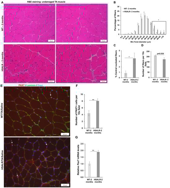 We wanted to determine if the age of HSALR mice has any effect on muscle regeneration response to damage. We used 2-month-old HSALR mice similar to our previous studies of the DM200 mouse model and Mbnl1 knockout mice. We compared two-month-old HSALR to age-matched wildtype (FVB) mice. H&E-stained sections of undamaged TA muscle showed that HSALR mice had larger fibers, more fibers with central nuclei, and fiber size variations compared to wildtype mice (Figure 5A). These results are similar to what we observed in 6-month-old TA muscles. Next, we analyzed the fiber size distribution. We found that TA muscles from HSALR mice showed a significant increase in the percentage of fibers (>50 µm) (p = 0.037) and a substantial increase in the fibers with central nuclei (p = 0.026) (Figure 5B,C). We also found a decrease in the number of fibers in HSALR mice (p = 0.059) (Figure 5D). In 6-month-old mice, the lower number of fibers was even more evident as compared to WT mice (p = 0.00075) (Figure 1D). We then assessed the number of MuSCs and Pax7 expression in the TA muscles of 2-month-old mice. Using PAX7 IF, we found a significant increase in the number of MuSCs in HSALR TA muscle compared to wildtype mice (p = 0.00997) (Figure 5E,F). Similar increases were seen using qRT-PCR for Pax7 (p = 0.0094) (Figure 5G). The fold increase in the number of MuSCs and Pax7 mRNA were similar to that seen with 6-month-old HSALR mice.