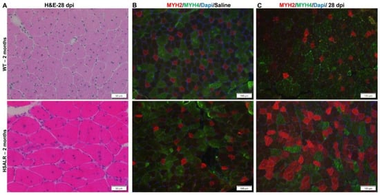 HSALR muscle shows fiber type switching at 28 days post injury in 2-month-old mice. (A) Representative image of H&E-stained TA muscle sections at 28 days post injury (dpi). Scale bars are shown. (B,C) MYH2 IF (Red), and MYH4 IF (green) in TA sections from uninjured TA (saline) (B) and 28 days post injury (28 dpi). (C) show an increased proportion of MYH2 fibers in the regenerated TA muscles of HSALR mice as compared to WT mice. Nuclei are stained with DAPI (blue). Scale bars are shown.