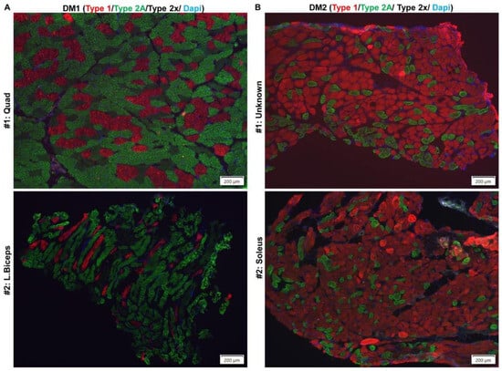 Representative images of immunofluorescence staining for MHC type 1 (red), type 2A (green), and type IIX (no staining) from (A) DM1 and (B) DM2 skeletal muscles. The Type 1 (MYH7) fibers are stained with antibody BA-D5 (DSHB), and the Type 2A (MYH2) fibers are stained with antibody SC-71 (DSHB). Nuclei are stained with DAPI (blue). Scale bars are shown.
