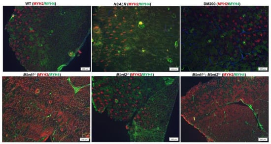 Another significant finding of this study is the switch in fiber type proportions after damage. The muscles in the human body are composed of a mixture of fiber types that exhibit both contractile (slow-twitch or fast-twitch) and metabolic (oxidative or glycolytic) properties. The muscle fiber type distribution can be disrupted with age and disease. In DM1, typically there is type 1 fiber atrophy (MYH7) and type 2 fiber hypertrophy [,,] (Pakleza-Foila Morphol 2011;Vihola-2003), whereas DM2 shows preferential atrophy of type 2 fibers resulting in a relative abundance of type 1 fibers (Figure 9) [,,]. It is challenging to study the muscle fiber switch in mice due to the relative lack of type 1 fibers in most murine muscles including the TA muscle. In the TA muscle of mice, type 2 fibers (Myh2 (IIA), Myh4 (IIB), and Myh1 (IIX) are expressed. Type IIA (Myh2) fibers are more oxidative than Type IIB (Myh4) fibers. In our study, the fiber type proportion in undamaged TA muscles from HSALR mice was similar to that in WT mice (Figure 4). The fraction of oxidative fibers (type IIA, Myh2) is increased in regenerated TA muscles from HSALR mice, whereas the fraction of glycolytic fibers (type IIB, Myh4) is decreased. This was not seen with WT mice. We reevaluated fiber type distribution in various models and found that undamaged TA from HSALR, DM200, and Mbnl2−/− mice are similar to WT TA muscles with a predominance of Type IIB fibers (Figure 10). However, TA muscles from Mbnl1−/− and Mbnl1−/−/Mbnl2+/− mice showed a dramatic fiber type switch to Type IIA predominance. After induced damage, only HSALR TA muscles showed a noticeable fiber type switch, such that they now resembled TA muscles from Mbnl1−/− mice (Figure 11). These results demonstrate a substantial fiber type switch to more oxidative fibers. This resembles the human DM2 condition, characterized by a reduced fraction of glycolytic fibers, and a marked shift to more oxidative fiber types (see Figure 9 and Figure 11) []. This contrasts with the changes in DM1 and the DM200 model, which are more similar to each other. This may be a reflection of what cell types and fiber types the toxic RNA is expressed in as well as its nature (i.e., CUG repeats in the context of HSA 3′UTR versus the DMPK 3′UTR).