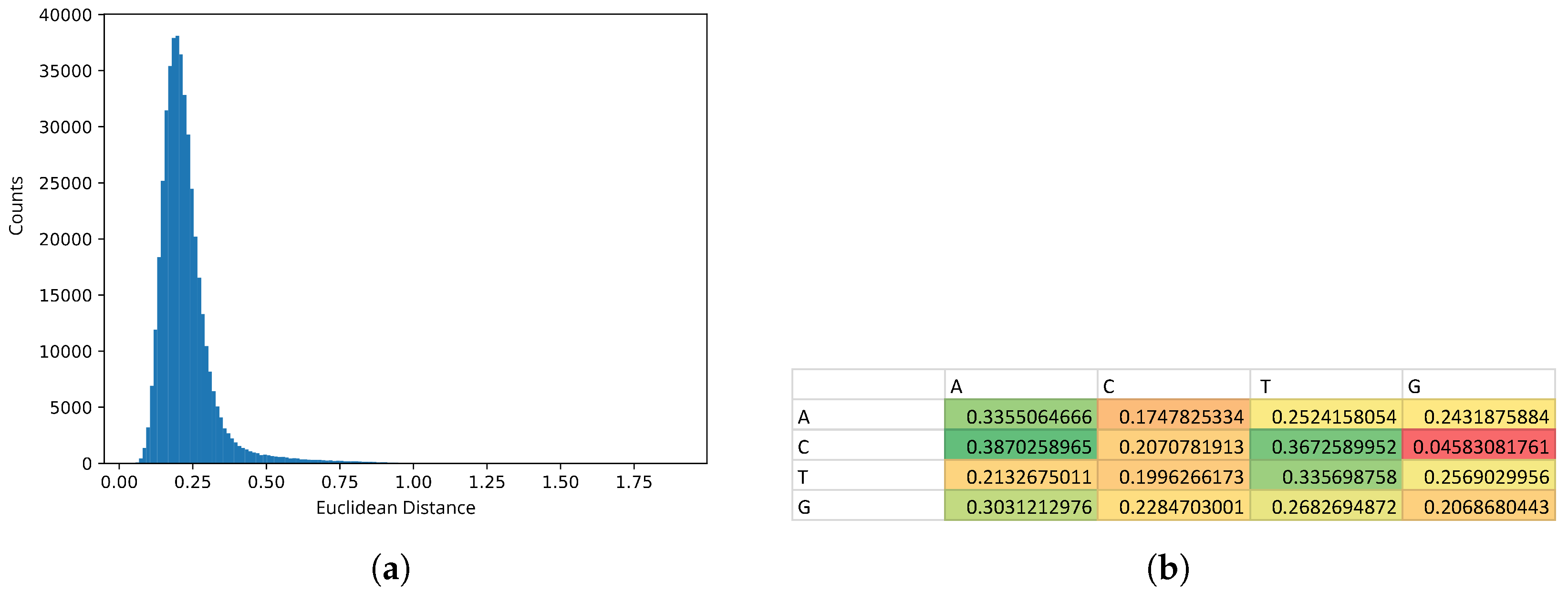 19]. However, the likelihood metric for a genomic sequence—calculated as the product of the conditional probabilities of nucleotides—clearly depends on the sequence length, complicating direct comparisons between sequences of different lengths. In this study, we proposed a metric based on the Euclidean distance between matrices of conditional probabilities for each sequence. Although this approach does not provide a direct estimate of sequence likelihood, it facilitates straightforward comparison between sequences of equal length.