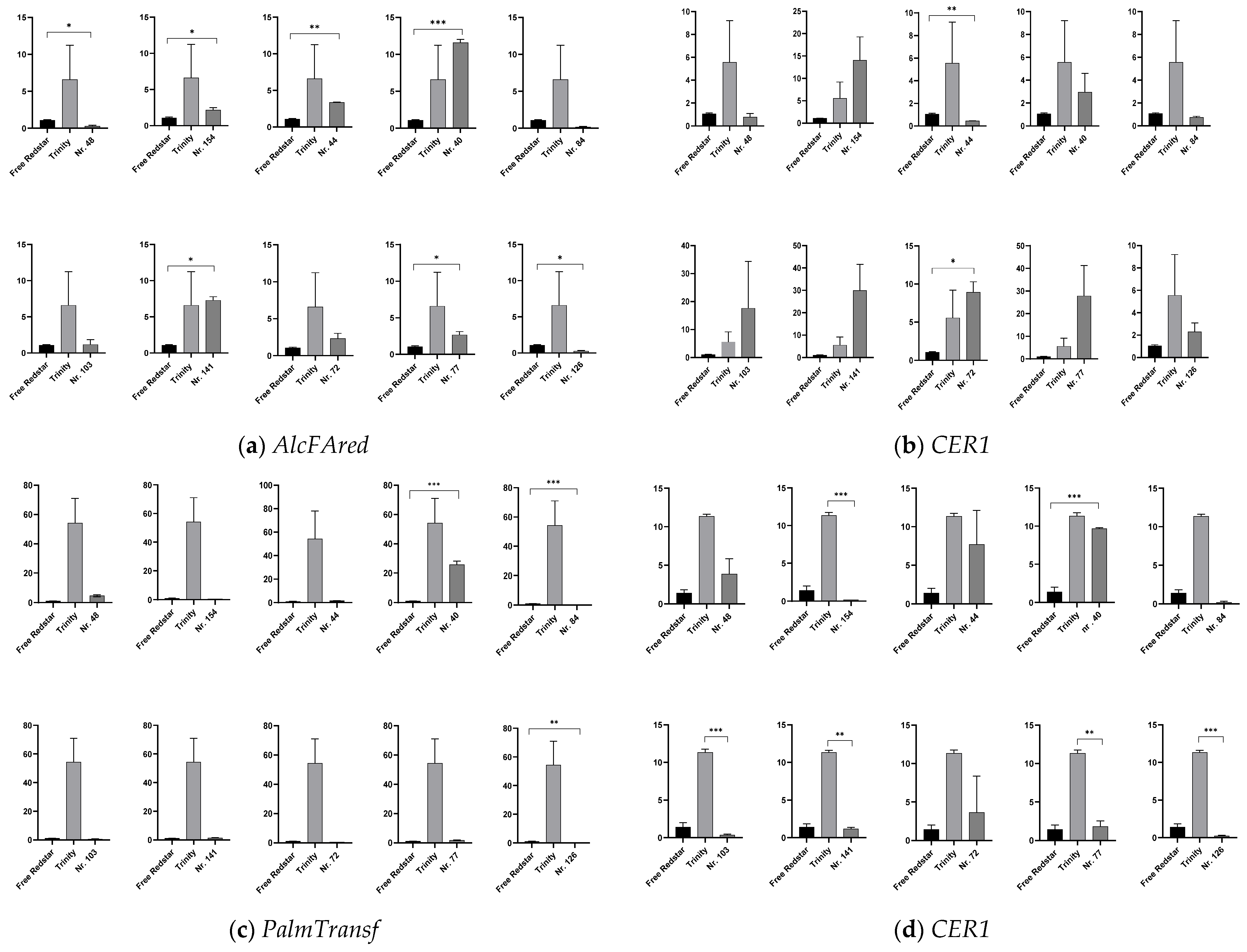 - Chai, G.; Li, C.; Xu, F.; Li, Y.; Shi, X.; Wang, Y.; Wang, Z. Three endoplasmic reticulum-associated fatty acyl-coenzyme a reductases were involved in the production of primary alcohols in hexaploid wheat (Triticum aestivum L.). BMC Plant Biol. 2017, 18, 41. [Google Scholar] [CrossRef]