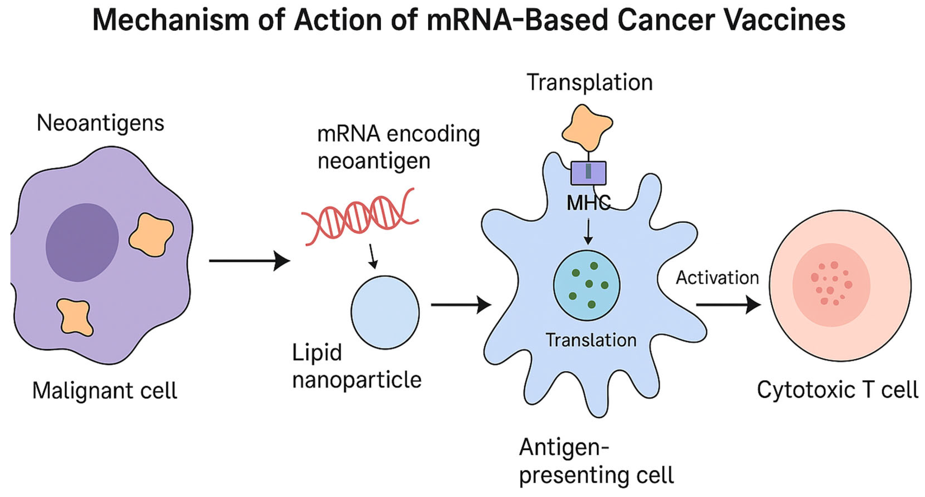 50]. LNPs form particles capable of protecting mRNA and efficiently fusing with cell membranes to deliver the mRNA into the cytosol. These carriers facilitate efficient transport of mRNA into immune cells, particularly dendritic cells, which subsequently present the translated antigens on their surface via MHCs—an essential step for initiating adaptive immune responses [
