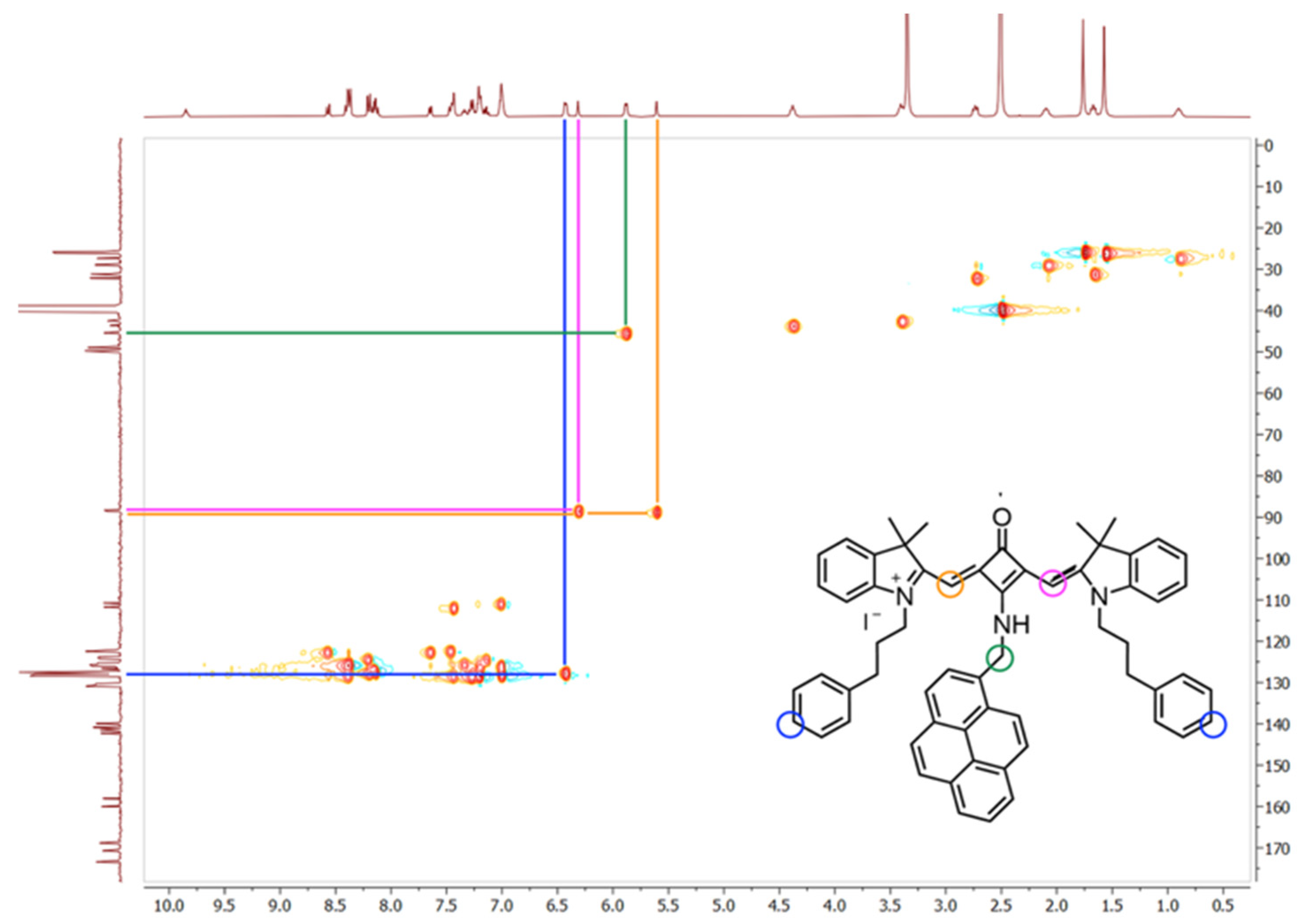 In a 100 mL round bottom flask, pyrenemethylamine hydrochloride (0.20 g; 0.75 mmol), 0.061 mL of dry pyridine (0.059 g; 0.75 mmol), and 6 mL of dry dimethylformamide were mixed at room temperature, under stirring and a nitrogen atmosphere. After complete dissolution, a solution of the O-methylated dye 5 (0.20 g; 0.25 mmol) in dry dichloromethane (25 mL) was slowly added and allowed to react for 3 h. The mixture was transferred to a 100 mL extraction ampoule, and dichloromethane was added to dilute, and 3 washes with distilled water were performed. The organic phase was recovered, dried with anhydrous sodium sulfate, filtered gravimetrically, and the solvent removed to dryness on a rotary evaporator. After the addition of 10 mL of methanol and 10 mL of a 14% potassium iodide aqueous solution (1.4 g; 8.43 mmol), the mixture was allowed to react, under stirring, for 30 min. A paste was obtained, which was dissolved with dichloromethane and washed with distilled water 3 times in an extraction ampoule. After separation of the organic phase, dried with anhydrous sodium sulfate, gravimetrically filtered, and the solvent removed in the rotary evaporator, the obtained residue was washed several times with a 1:1 mixture of ice-cold ether and methanol, and proceeding with recrystallizations with these same solvents, it was possible to obtain pure green crystals with a 37% yield. M.p.: 231–232 °C. Vis λmax (DMSO): 661 nm; ε = 196,583 M−1·cm−1. IR ʋmax (KBr): 3088 (w, NH), 3036 (w, ArCH), 2957 (w, CH), 2922 (w, CH), 1630 (m, ArC=C), 1611 (w), 1560 (m), 1491 (s), 1479 (s), 1458 (s), 1356 (w), 1281 (s), 1240 (m), 1150 (s), 1117 (m), 1096 (m), 1057 (w), 1020 (w), 968 (w), 924 (w), 843 (w), 795 (w), 746 (m), 683 (w), 552 (w) cm−1. 1H NMR (DMSO-d6, 400.13 MHz) δ: 9.84 (1H, br t, J = 5.6, NHCH2, exchange with D2O), 8.57 (1H, d, J = 9.2, ArH), 8.41–8.36 (4H, m, ArH), 8.21–8.12 (4H, m, ArH), 7.65 (1H, d, J = 7.6, ArH), 7.48–7.43 (3H, m, ArH), 7.34 (1H, t, J = 7.6), 7.30–7.24 (2H, m, ArH), 7.23–7.19 (4H, m, ArH), 7.14 (1H, t, J = 6.8), 7.02–6.99 (4H, m, ArH), 6.44–6.42 (2H, m, ArH), 6.32 (1H, s, CH=C), 5.88 (2H, d, J = 6.0, NHCH2Pyrene, collapse to s with D2O), 5.61 (1H, s, CH=C), 4.37 (2H, t, J = 6.8, NCH2CH2CH2Ph), 3.40 (2H, d, J = 6.8, NCH2CH2CH2Ph), 2.74 (2H, t, J = 8.2, NCH2CH2CH2Ph), 2.10 (2H, qt, J = 7.6, NCH2CH2CH2Ph), 1.76 (6H, s, C(CH3)2), 1.67 (2H, t, J = 8.4, NCH2CH2CH2Ph), 1.57 (6H, s, C(CH3)2), 0.90 (2H, qt, J = 7.2, NCH2CH2CH2Ph) ppm. 13C NMR (DMSO-d6, 100.62 MHz) δ: 173.42, 173.28, 170.73, 168.85, 160.03, 158.06, 142.27, 141.60, 141.46, 141.38, 140.86, 139.93, 130.91, 130.54, 130.34, 128.41 (ArCH), 128.30 (ArCH), 128.14 (ArCH), 128.00 (ArCH), 127.50 (ArCH), 127.33 (ArCH), 126.60 (ArCH), 125.77 (ArCH), 125.72 (ArCH), 125.61 (ArCH), 125.46 (ArCH), 125.26 (ArCH), 124.38 (ArCH), 124.29 (ArCH), 124.18 (ArCH), 123.81 (ArCH), 122.47 (ArCH), 122.16 (ArCH), 111.74 (ArCH), 110.76 (ArCH), 88.57 (CH=C), 88.29 (CH=C), 49.75 (C(CH3)2), 48.97 (C(CH3)2), 45.41 (NHCH2Pyrene), 43.61 (NCH2CH2CH2Ph), 42.48 (NCH2CH2CH2Ph), 32.11 (NCH2CH2CH2Ph), 31.13 (NCH2CH2CH2Ph), 28.94 (NCH2CH2CH2Ph), 27.35 (NCH2CH2CH2Ph), 26.11 (C(CH3)2), 25.77 (C(CH3)2) ppm. HRMS m/z: 846.441816 [M–I]+ (C61H56N3O calc. 846.441790).