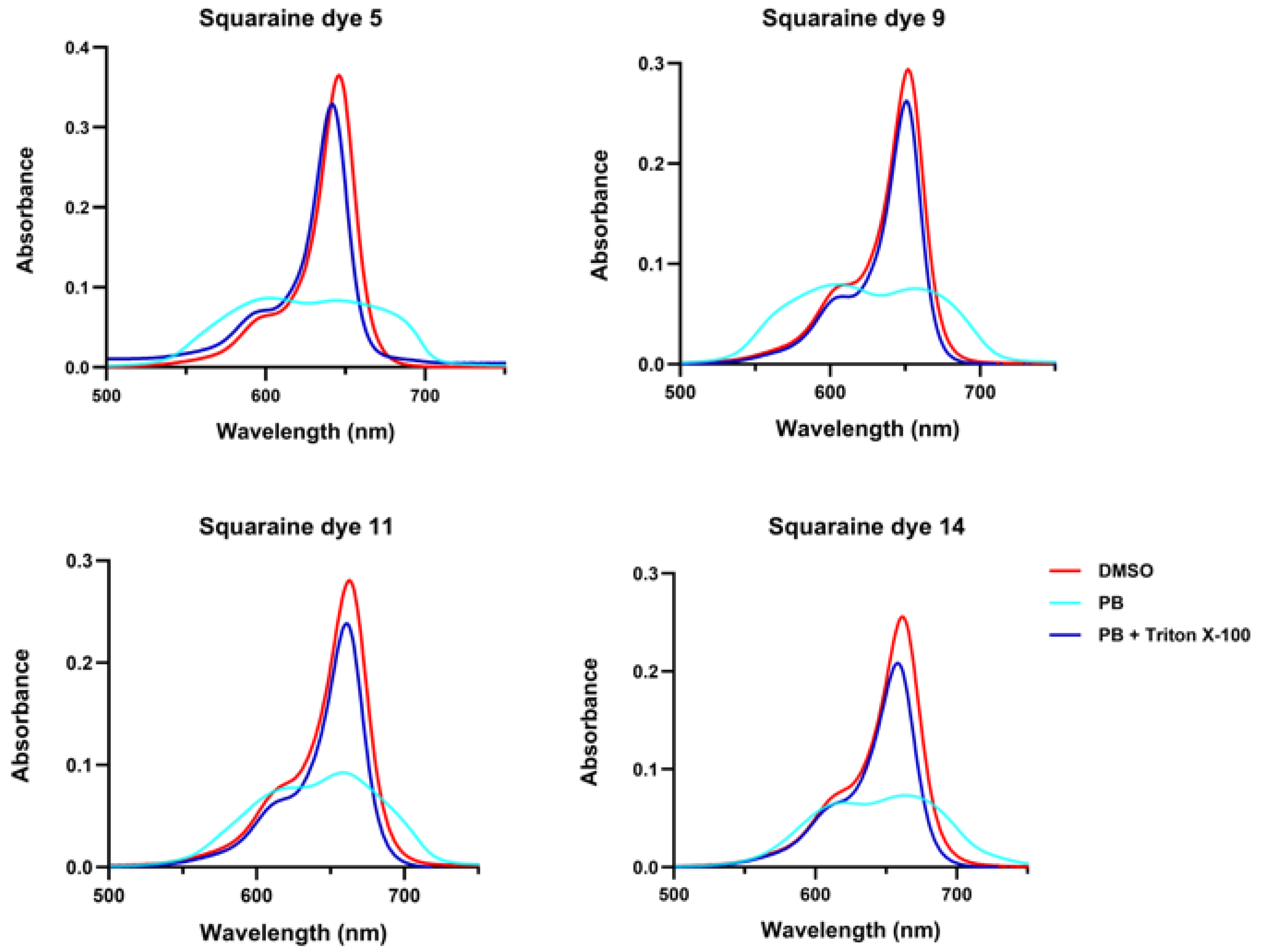 14 appeared to predominantly form J-aggregates, as suggested by the stronger red-shifted features observed visually. Upon the addition of Triton X-100 detergent, the aggregates were disrupted, and the absorption spectra of all dyes closely resembled those recorded in dimethyl sulfoxide, demonstrating that the compounds dissociated into their monomeric forms under these conditions.