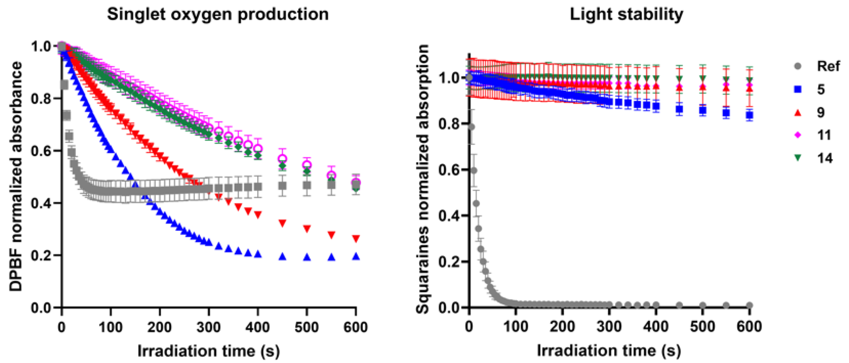 Photophysically, the synthesized squaraine dyes exhibited several key properties required for applications in both areas of interest: unlike porphyrins, the main class of clinically approved photosensitizers that absorb at shorter wavelengths [