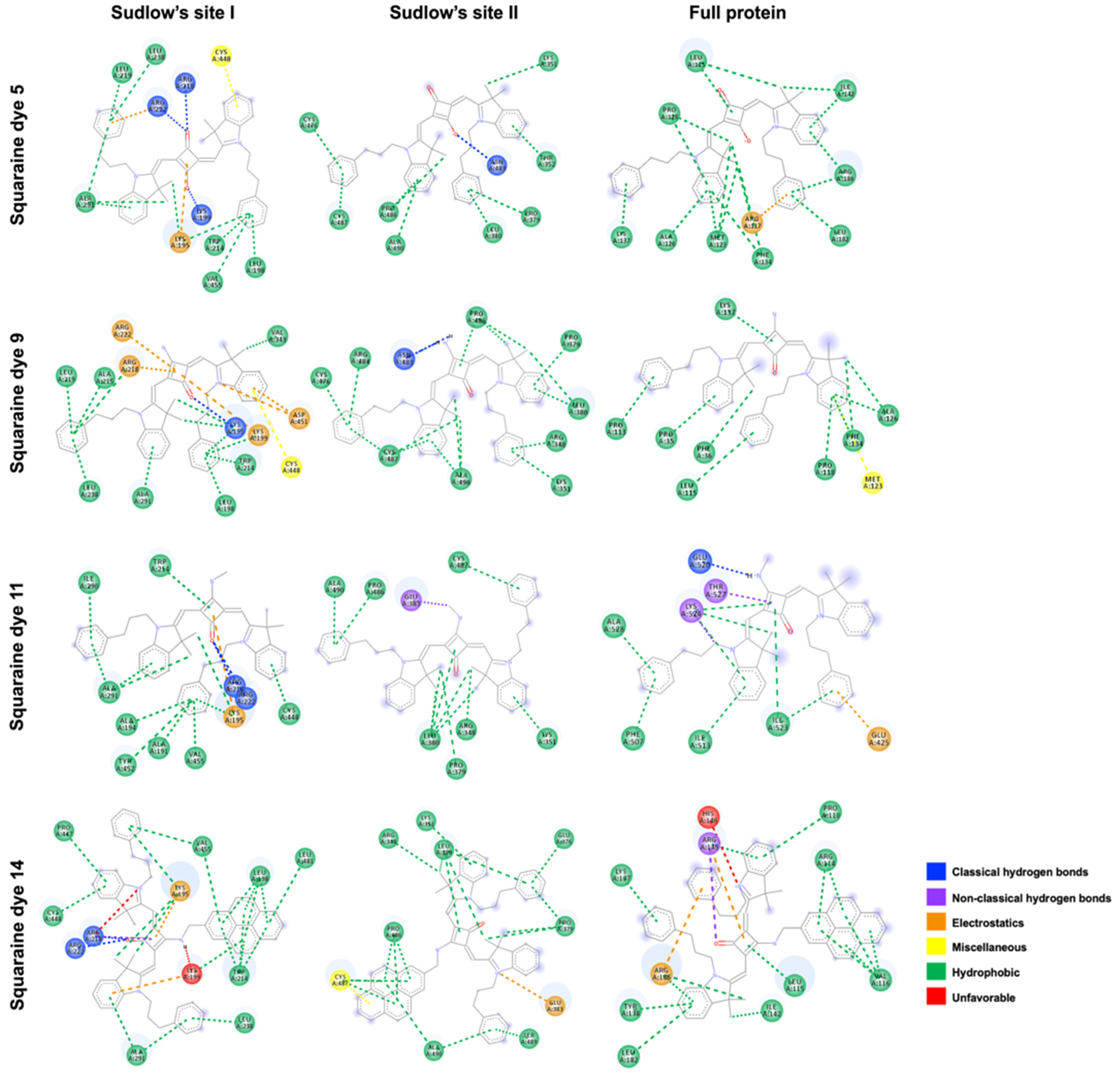 Despite the promising in silico interaction profile predicted for dye 14, bearing the aminomethylpyrene group, this high potential was not fully corroborated by the in vitro results. Instead, methylamino-functionalized dye 11 exhibited markedly higher binding constants, indicating a stronger actual interaction with the protein than computationally anticipated. This discrepancy highlights the influence of factors beyond static docking predictions, such as solvation effects, dye aggregation, and the conformational flexibility of HSA, on the real binding behavior in solution. The pronounced interaction of this dye with the protein was further evidenced by an approximately 360-fold fluorescence enhancement, far exceeding that of the other dyes tested, none of which surpassed a 100-fold increase relative to their baseline emission. From the perspective of their potential as fluorescent probes, the unsubstituted dye 5 proved most effective in vitro, enabling the detection and quantification of albumin at considerably lower concentrations than its amino-substituted squaraine analogues, which displayed higher detection and quantification limits. However, a notable limitation was the slow kinetics of binding, as the interaction required at least one hour of incubation to reach equilibrium, a drawback that may restrict its suitability for diagnostic, biochemical, or biotechnological applications demanding rapid response times.