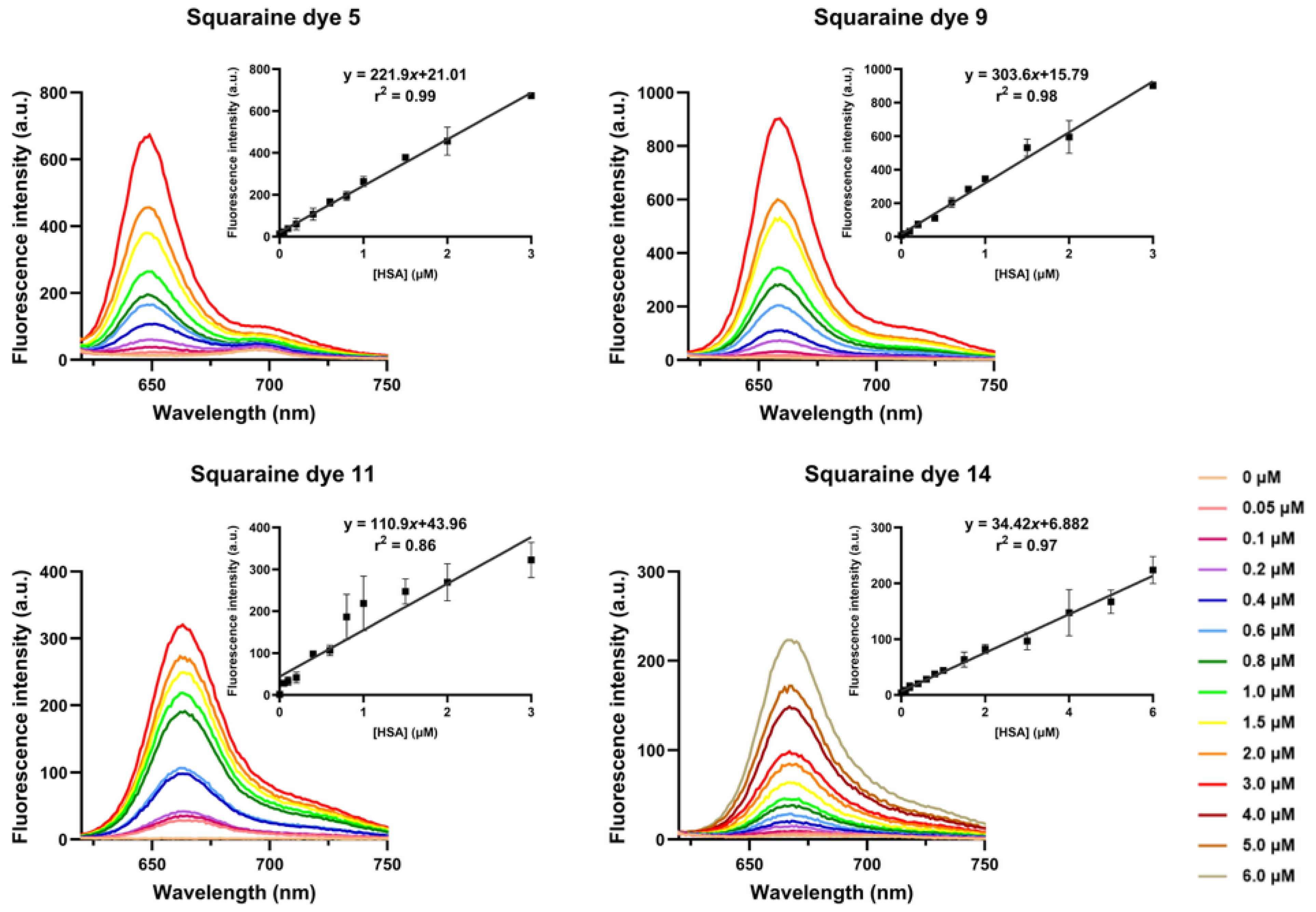 Fluorescence intensity was measured at 0 min, 3 h, and 24 h to determine the incubation time required for maximum interaction between each dye and HSA. Overall, all squaraines demonstrated binding to the protein, as evidenced by the increase in fluorescence intensity with higher protein concentrations. For amino- and methylamino-bearing dyes 9 and 11, maximum interaction occurred immediately upon addition to the protein solution, indicating that no incubation time is required and that these compounds bind to albumin almost instantaneously. In contrast, unsubstituted and aminomethylpyrene-containing dyes 5 and 14, respectively, reached their maximum fluorescence only after 24 h of incubation at room temperature, protected from light.