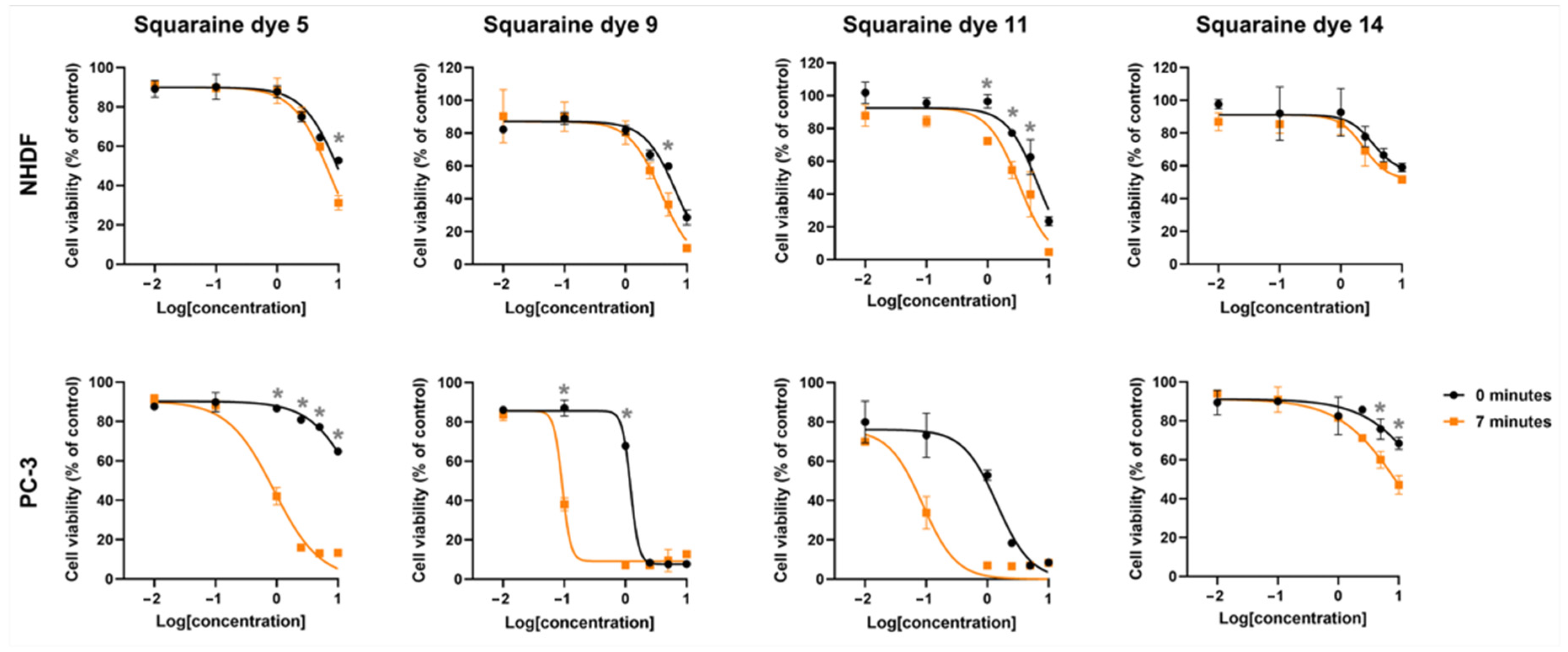 The introduction of different amine substituents into the four-membered central ring resulted in markedly distinct biological outcomes. Functionalization with amino and methylamino groups (squaraines 9 and 11, respectively) rendered the dyes highly promising, showing 13- and 16-fold increases in cytotoxicity upon irradiation, as well as 40.8- and 36-fold higher photocytotoxicity toward PC-3 cells compared to normal fibroblasts. In contrast, functionalization of the squaric ring with an aminomethylpyrene group (dye 14) did not prove to be as advantageous. Despite the slight differences in cell viability reduction observed for this latter dye across both cell lines, no significant effects were detected when compared to the other dyes evaluated. This was reflected in IC50 values exceeding 10 μM, the highest concentration tested.