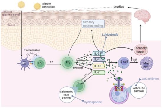 The figure was prepared by the authors. It conceptually summarizes the immunopathogenesis of canine atopic dermatitis and pharmacologic targets of anti-cytokine therapies, based on published data on Th2 cytokines, IL-31 signaling, and JAK/STAT and calcineurin/NFAT pathways.